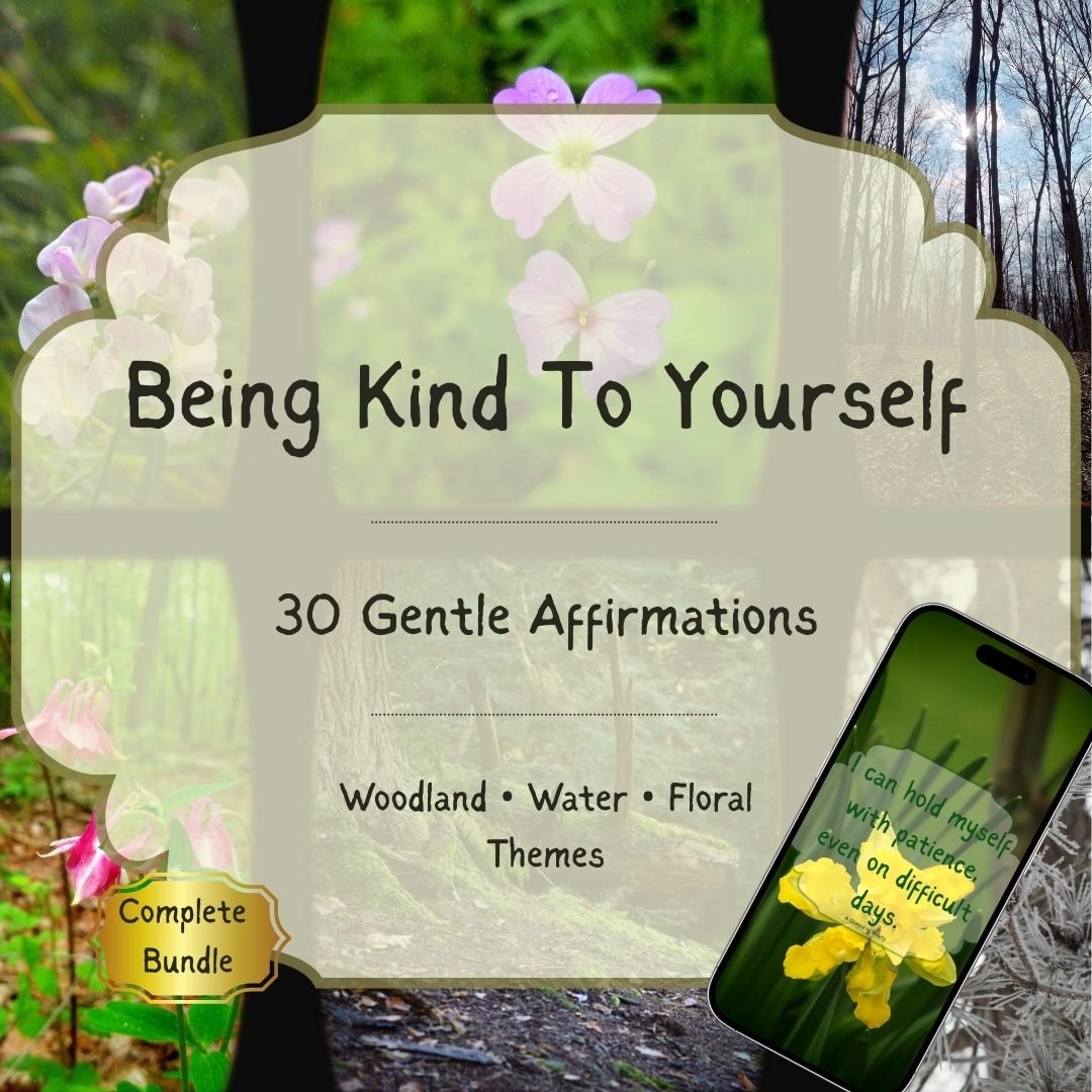 This bundle includes three nature-inspired affirmation wallpaper collections created to support your journey of being kind to yourself. Each collection pairs meaningful affirmations with peaceful nature photography, offering calming reminders you can carry with you throughout your day. With three visual themes — woodland, water, and flowers — you can choose the atmosphere that resonates with you most in the moment. Each theme offers a different emotional tone while supporting the same intention: encouraging compassion, reflection, and personal growth.