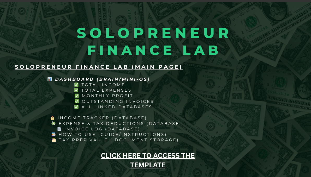 Solopreneur Finance Lab is an all-in-one Notion system designed for freelancers, creators, and solopreneurs to manage money without spreadsheets or complicated software.