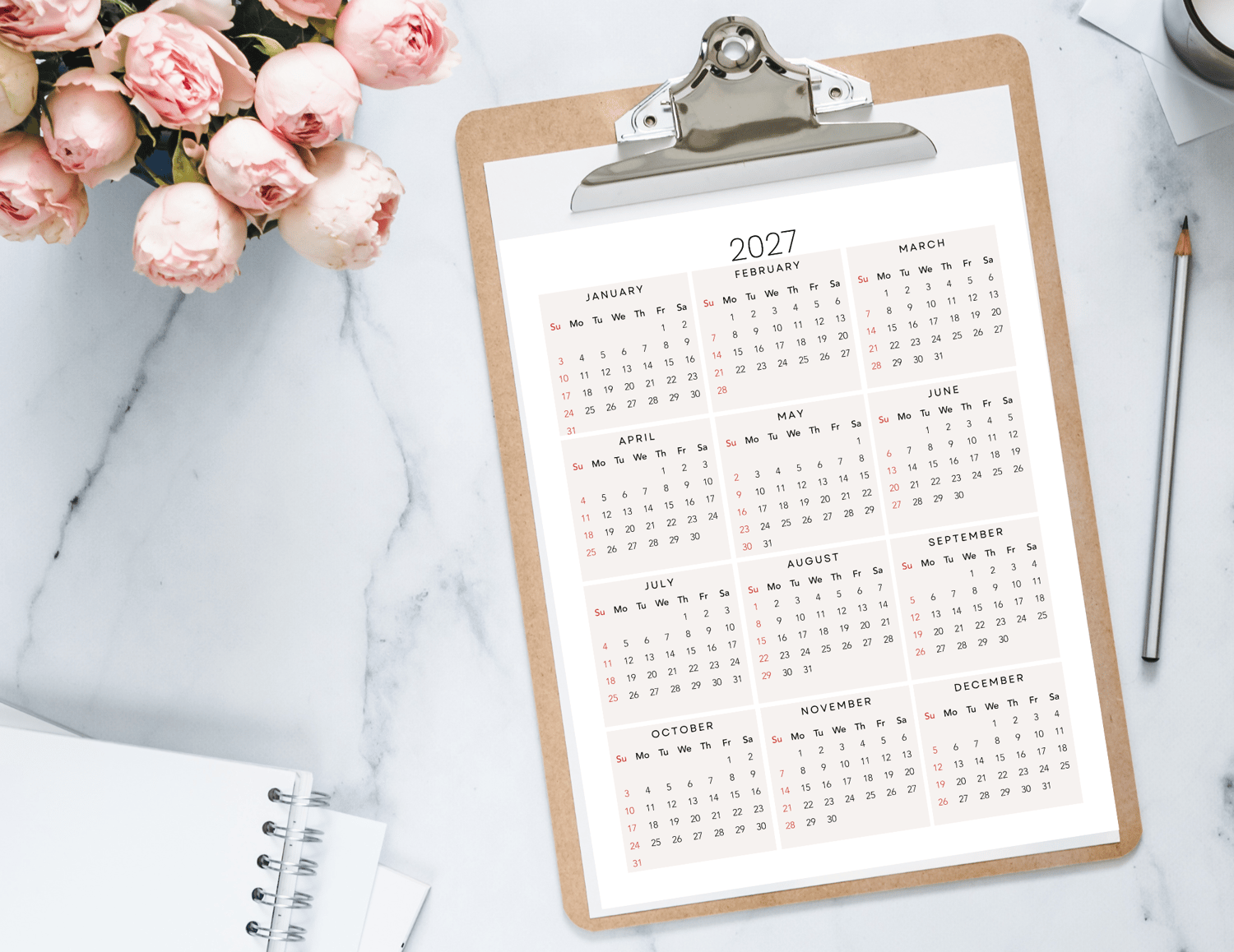 Stay organized all year long with this printable 2027 year-at-a-glance calendar — a digital download designed to bring simplicity and style to your space.
