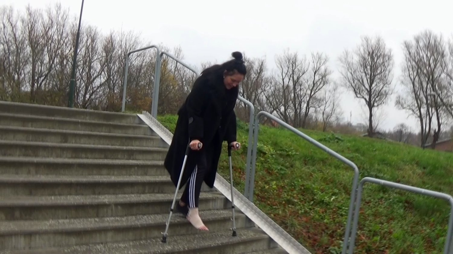 Flower has a bandage on her right foot after a sprain.She fights down a couple of stairs before sitting down on a bench to gather strength again and "waves" gently with the injured foot to us and say goodbye.