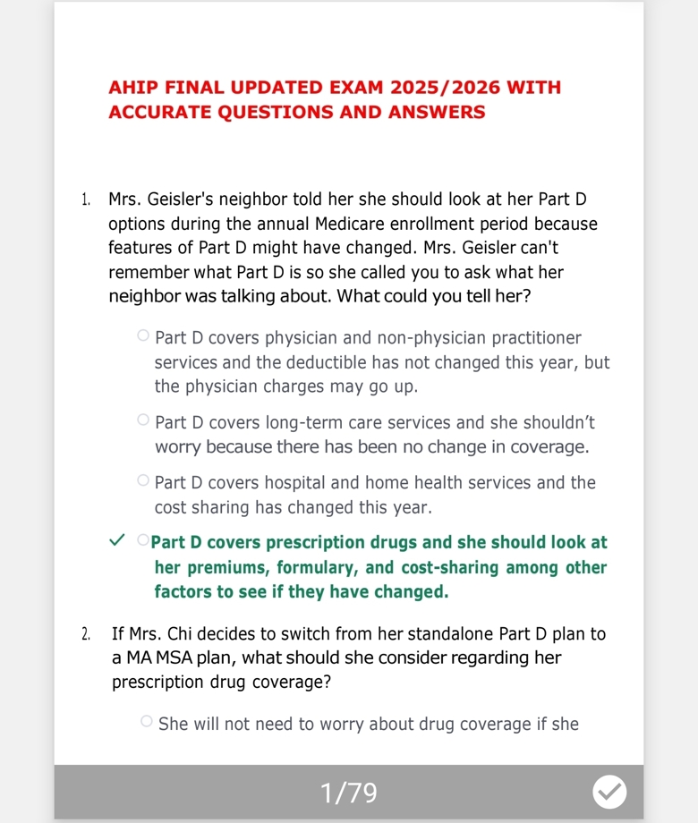 This AHIP Final Updated Exam 2025/2026 guide is outstanding. It includes full exams with correct answers and detailed rationale, matched to the current content requirements. It gave me clarity on tricky topics and boosted my confidence for the real test. Highly recommend for anyone prepping for the AHIP exam! #AHIPExam2025 #AHIPCertification #MedicareTraining #InsuranceAgents #AHIPFinalExam #MedicareAdvantage #PartDExam #InsuranceCertification #StudyGuide #VerifiedAnswers #ExamPrep #PassWithConfidence