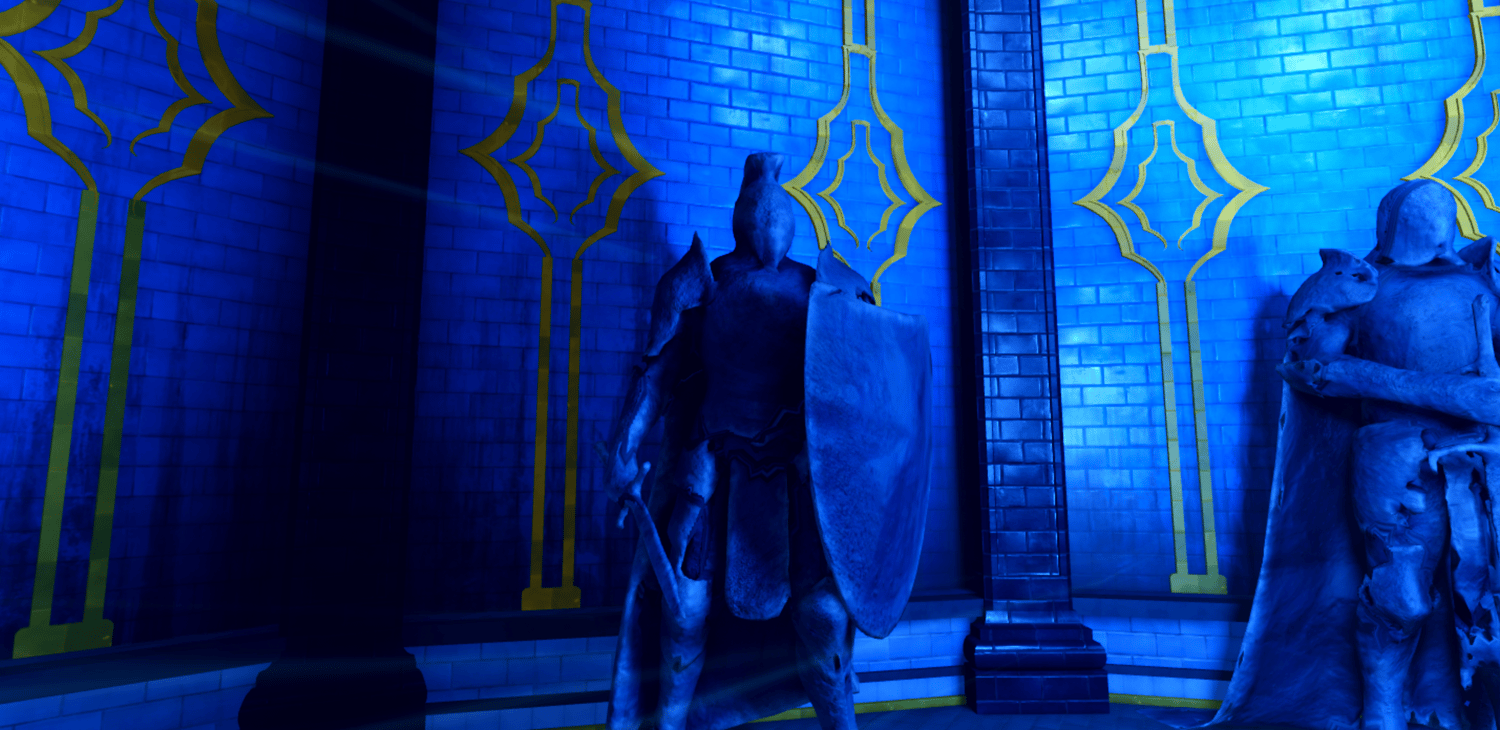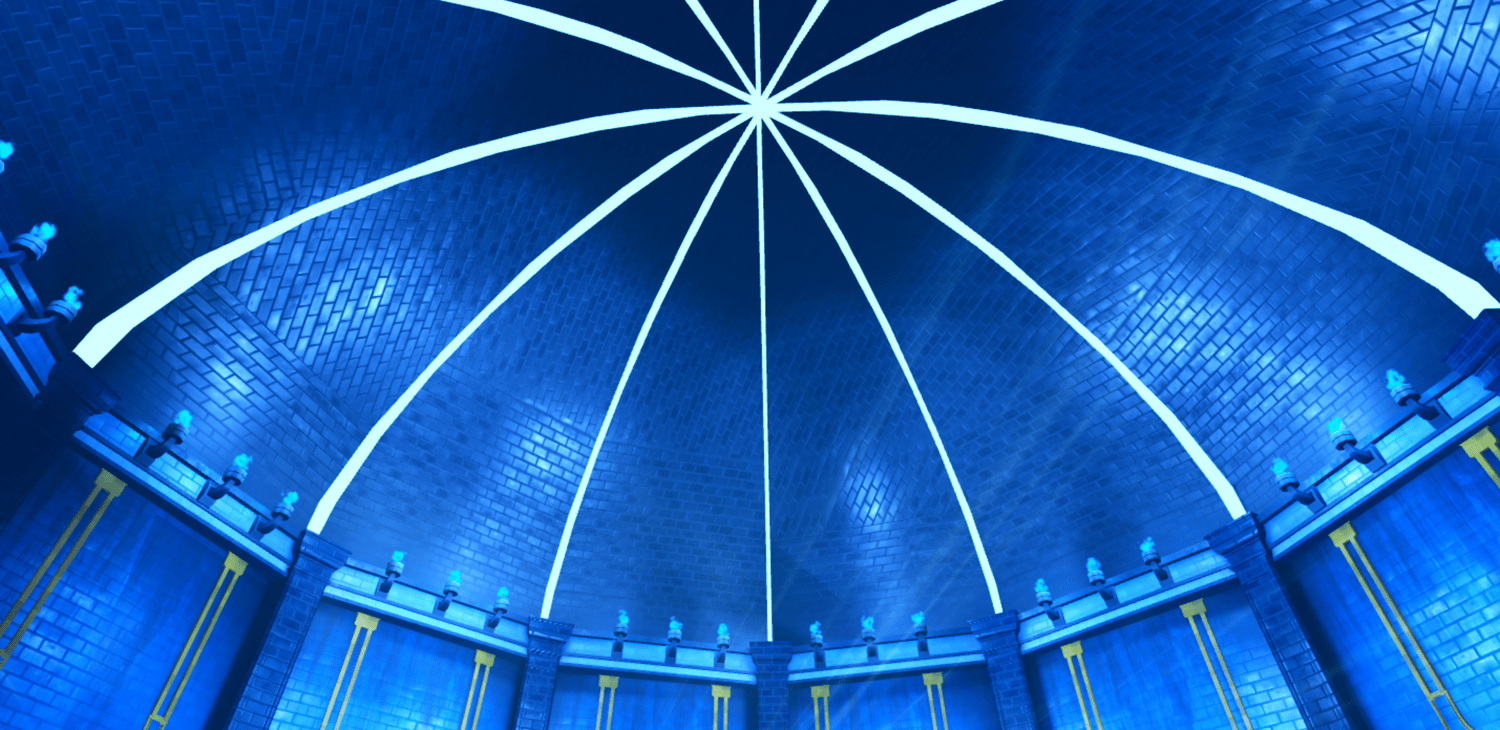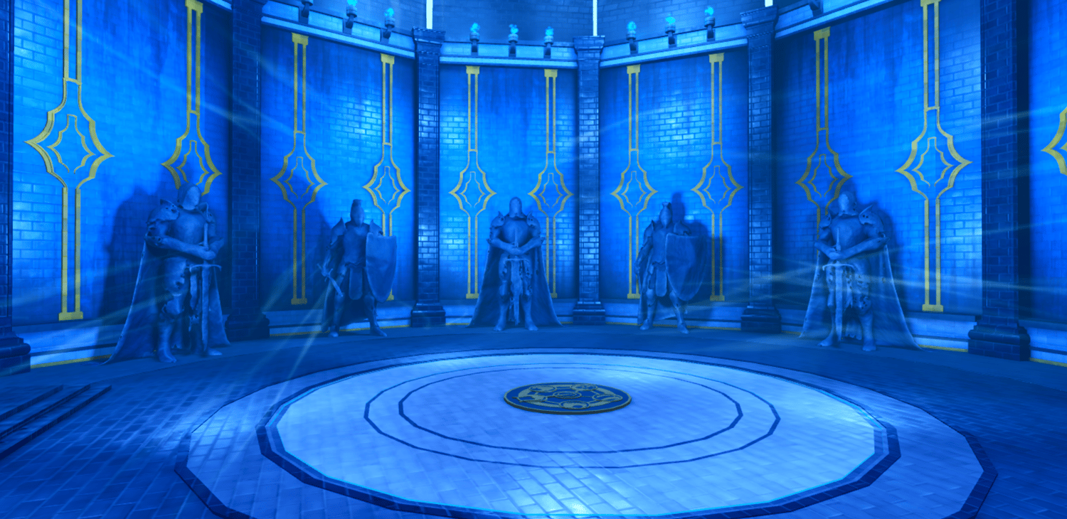 A stunning recreation of the Cartenon Temple from Solo Leveling, featuring the iconic circular chamber lined with towering stone statues of armored knights and a crowned god figure on a throne. Deep blue atmospheric lighting with golden ornamental accents bathes the room while glowing torches and ethereal energy effects add mystical tension. The domed ceiling with radiating light beams towers above the central arena marked with a golden emblem. Highly detailed statues capture the menacing presence of the double dungeon's guardians. The layout provides a dramatic arena for awakening scenes or boss encounters. Perfect for Solo Leveling fan games, anime RPGs, dungeon crawlers, boss fights, or cinematic showcases.