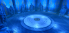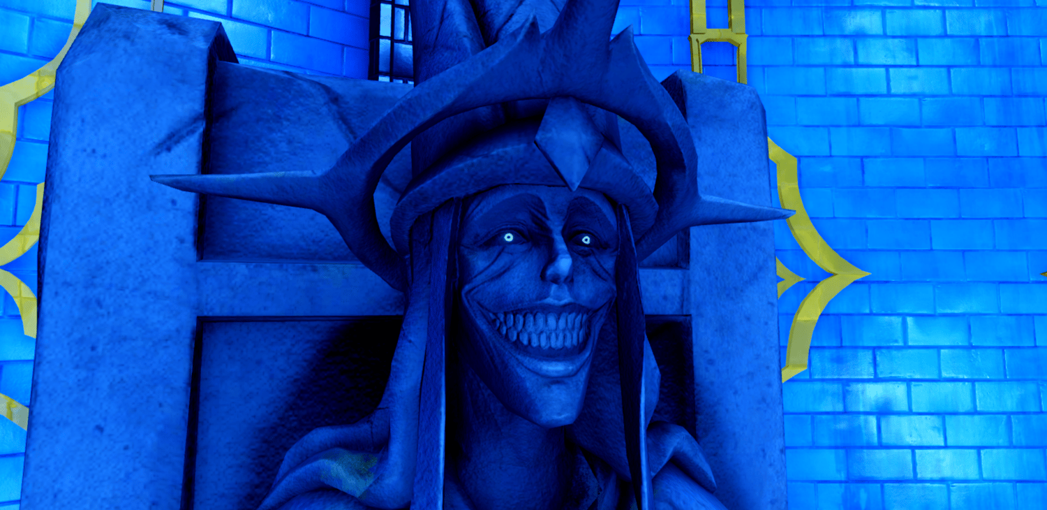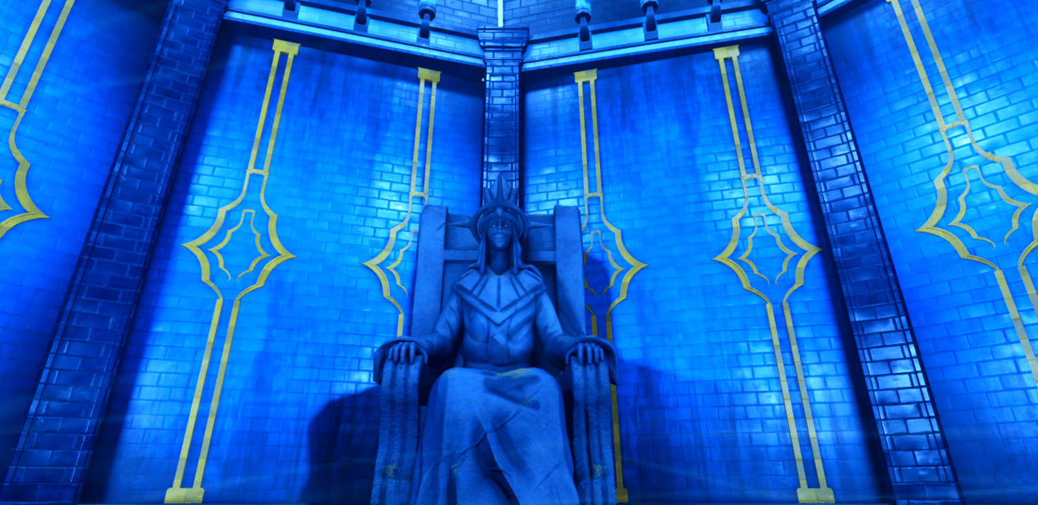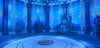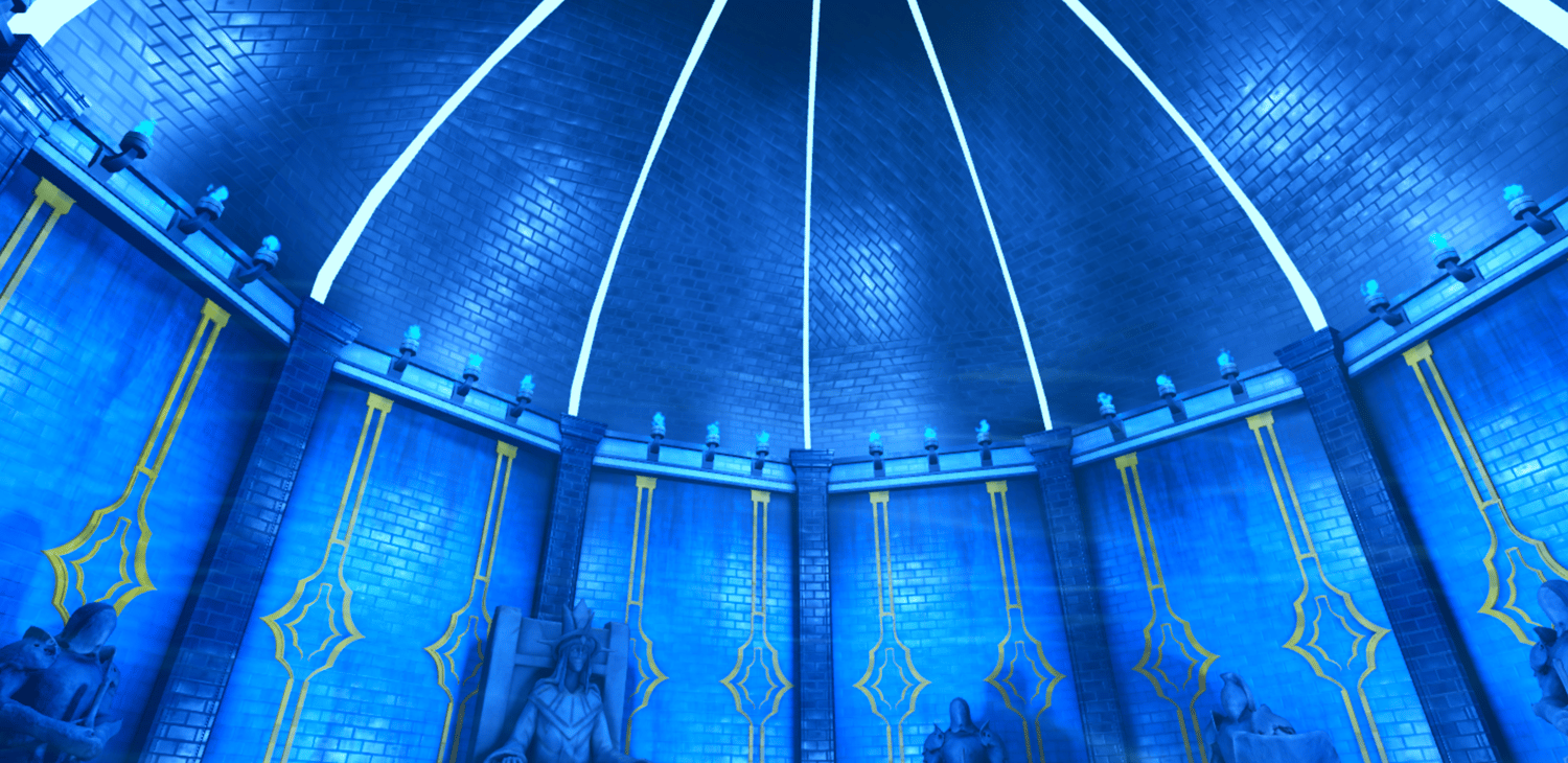 A stunning recreation of the Cartenon Temple from Solo Leveling, featuring the iconic circular chamber lined with towering stone statues of armored knights and a crowned god figure on a throne. Deep blue atmospheric lighting with golden ornamental accents bathes the room while glowing torches and ethereal energy effects add mystical tension. The domed ceiling with radiating light beams towers above the central arena marked with a golden emblem. Highly detailed statues capture the menacing presence of the double dungeon's guardians. The layout provides a dramatic arena for awakening scenes or boss encounters. Perfect for Solo Leveling fan games, anime RPGs, dungeon crawlers, boss fights, or cinematic showcases.