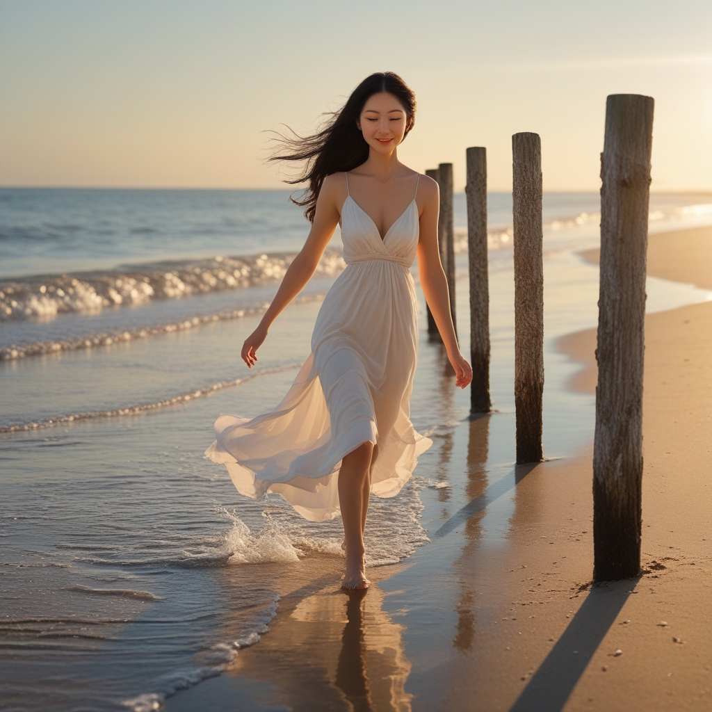 Artistic portrait photography of a serene woman with delicate facial features and a gentle smile, her skin a warm golden brown from the sun, walking gracefully along a single row of weathered wooden poles planted in the sand at the edge of the beach, with each step flowing with calm precision, her balance effortless and sure, her long, dark hair blowing softly in the breeze. The shallow water from a fading wave glimmers beneath her, mirroring her movement in soft, rippling reflections, as the warm light of the setting sun casts a golden glow on the scene, with the woman's slender figure and flowing white dress standing out against the muted tones of the beach and the poles, and the horizon stretching out to meet the sky at a gentle curve.