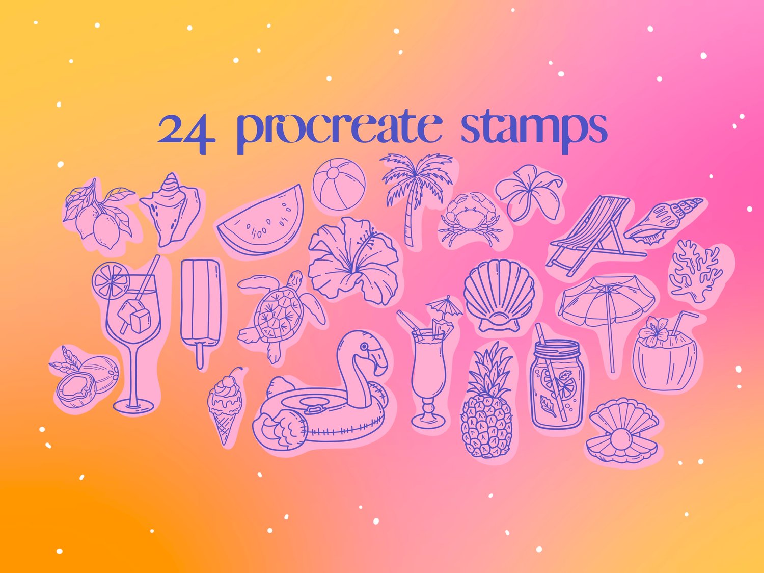 Procreate summer stamp brushes – 24 tropical stamp brushes for procreate, cute summer doodles, beach party, vacation, flamingo, travel vibes