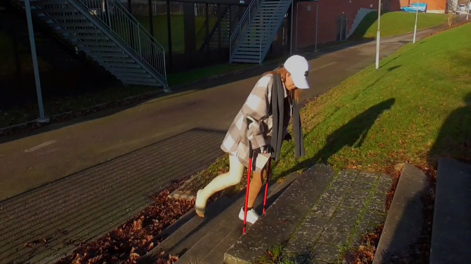 Elina is struggling to get out of the car because of her very big and white cast on her right leg. She grabs the car door and drags herself out, jumps to the trunk to get her crutches. Although Elina is in a great pain she still laughed because she couldn’t get the trunk to open at first. Elina then finally got her crutches out and started to crutch towards the closest building. She’s breathing heavily already and takes a small break before she continues to crutch towards the athletics fields. Suddenly Elina stumbles on her good foot and yelled out in pain, she crutches slowly forward and tries to hold her casted leg up because it’s almost dragging on the ground. The way up to the athletics fields is lined up with stairs and Elina has to face a very hard and challenging adversity, she barely makes the jumps. Is she going to be okay? It gets more and more painful, Elina can’t help but moaning in pain. She then stumbles on her injured foot and hurt her toes even more as she heads towards somewhere to sit at. Elina looks very cold and desperate.