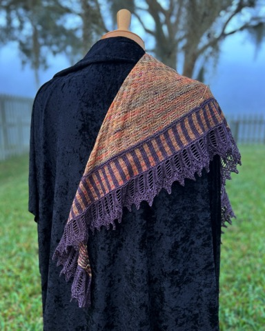 When I saw a colorway named “The Haunted Wood” I knew I needed to do a shawl with it! I don’t care for stranded colorwork much, but these slip stitch stripes are so lovely, and you’d never know they weren’t stranded. And anytime I think of anything haunted, my favorite cartoon Scooby Doo comes to mind. So, you get the Meddlesome Shawl – because they would have gotten away with it if not for those meddling kids!