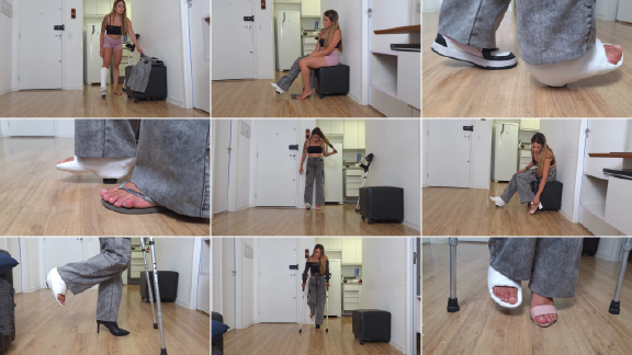 - Trying on different shoes (high heels, high-heeled boots, sneakers, and flip-flops) and showing them to the camera. Walking with each of them, and trying to walk on crutches in high heels.
