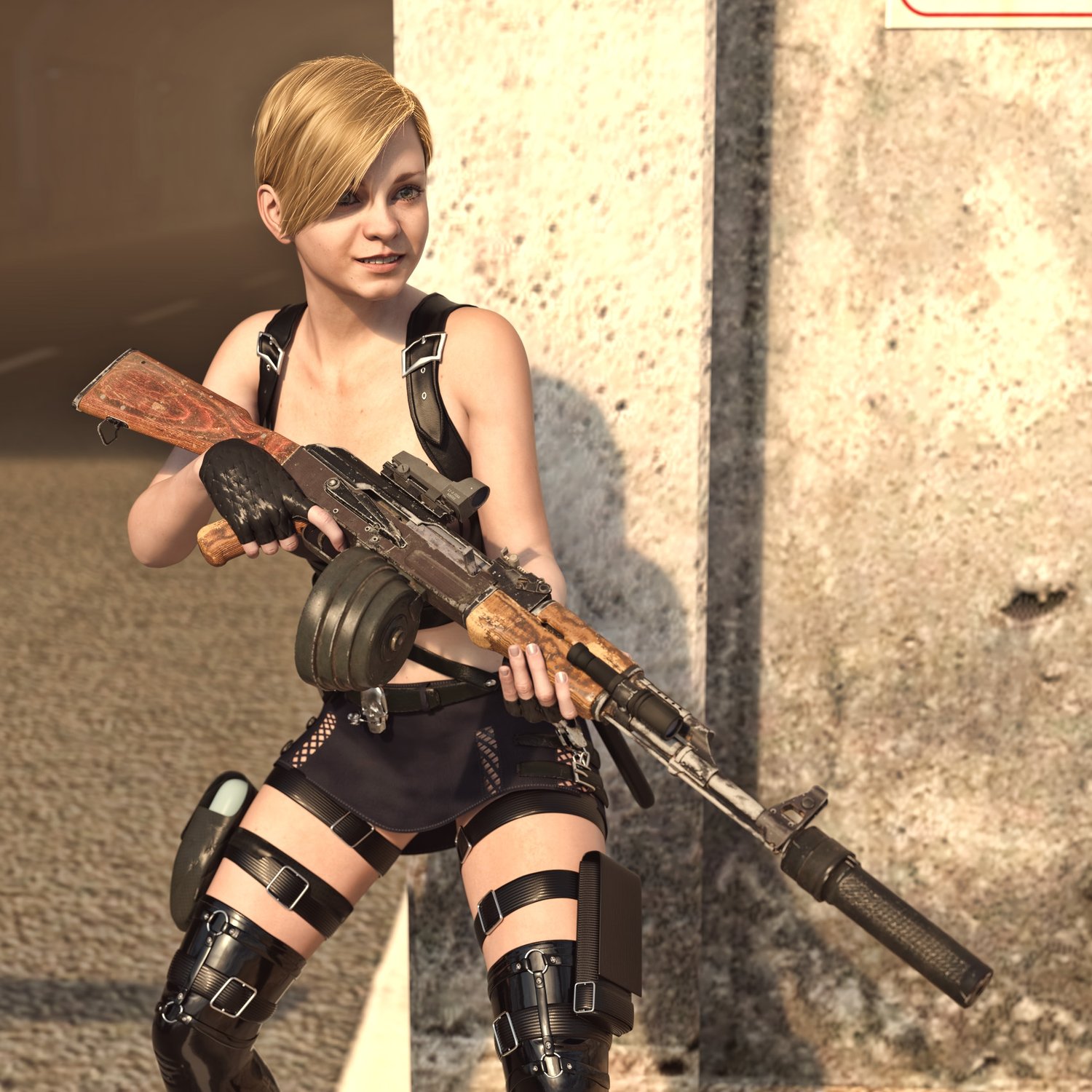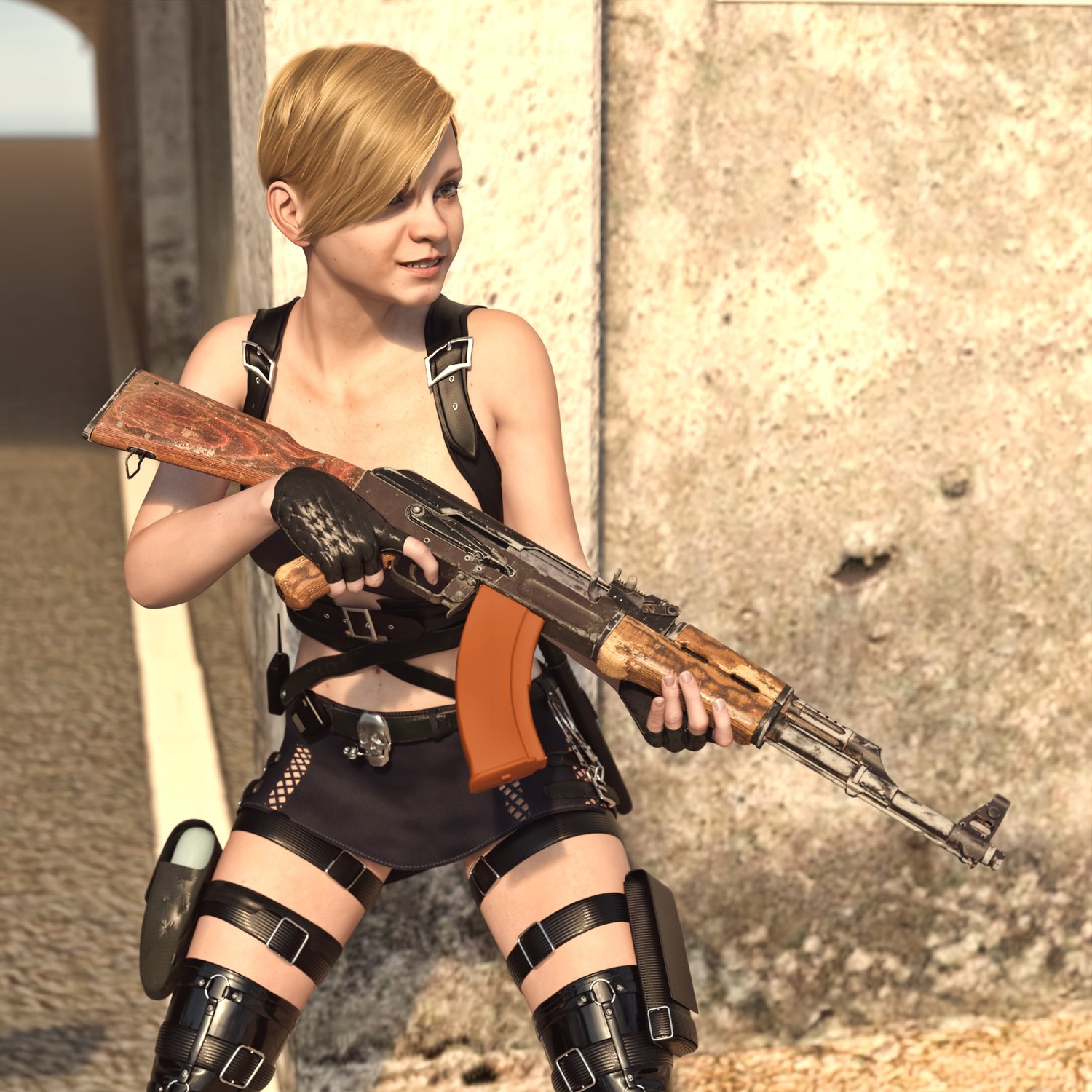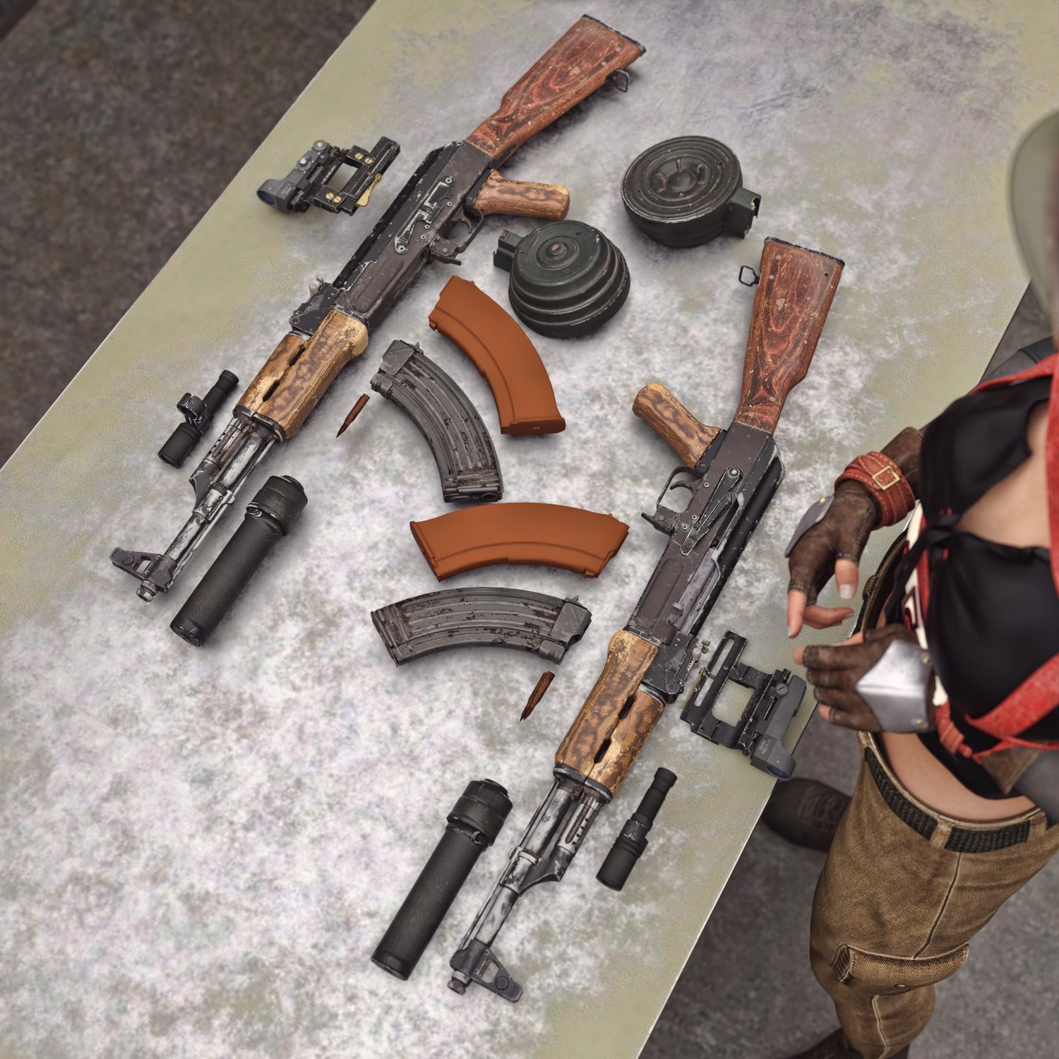 A classic variant of a popular combat rifle, rigged and converted for use with DAZ. Trigger, safety, bolt, silencer, etc also rigged for more realistic pictures. I did drop some attachments for various customizations porpoises and pictures, but you can also use it as a simple unmodified AK 47‥ Includes a drum mag, so you have loads of ammo for all your enemies, a bakelite mag, a metal mag, a red dot with attachment, light and silencer.
