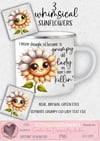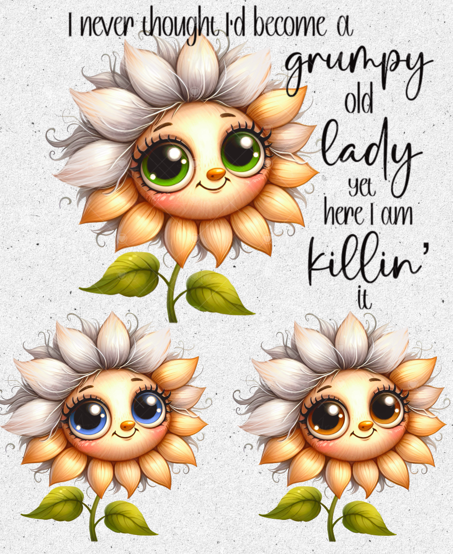Humour, funny, adorable sunflower x 3; blue, green and brown eyes + grumpy old lady text file. 4 PNGs. Ideal mug, t shirt, coaster etc. Please note that no physical items are supplied. These are digital files for sublimation or print.