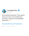 - "Personalized itineraries just for you! Let me, your Travel Agent, tailor your next trip to your preferences. 🌴✨ #TravelPlanning #PersonalizedTrips"