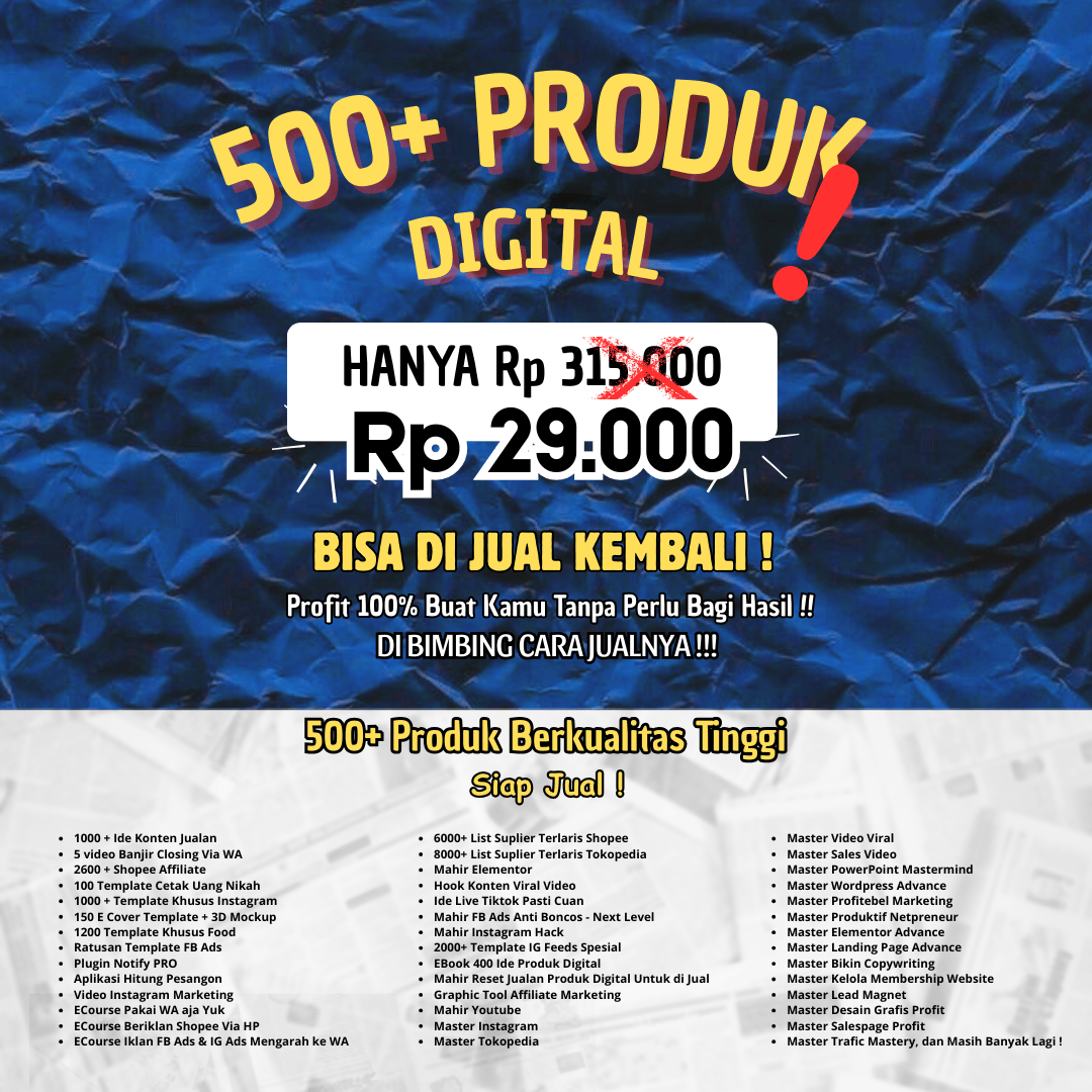 📣 Ingat! Kamu hanya cukup sekali bayar Rp 29.000, langsung bisa punya 500+ produk digital siap jual dengan profit 100% untuk kamu!