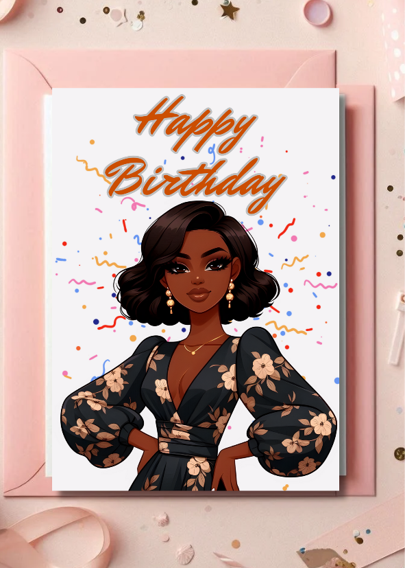 Forget basic, boring cards. This digital masterpiece features a confident, gorgeous African American woman radiating pure sassy elegance, surrounded by all the celebratory confetti. It's the perfect way to tell your bestie, sister, mom, or any incredible lady: 'Yes, girl, it's your day to shine!'