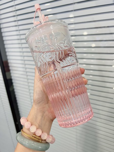 2023 Starbucks China Sakura 18.6oz Pink Gradient Glass Tumbler with Cherry Blossom Straw Topper
