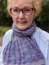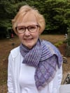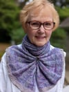 Transmit is a scarf with flaired ends, transmitting triangle stitch in widening rows. The ends can be styled in a variety of ways, or simply wrapped around the neck. Holding two yarns together allows a hand dyed mohair to color in the scarf, but leave stripes of wool for a frame.