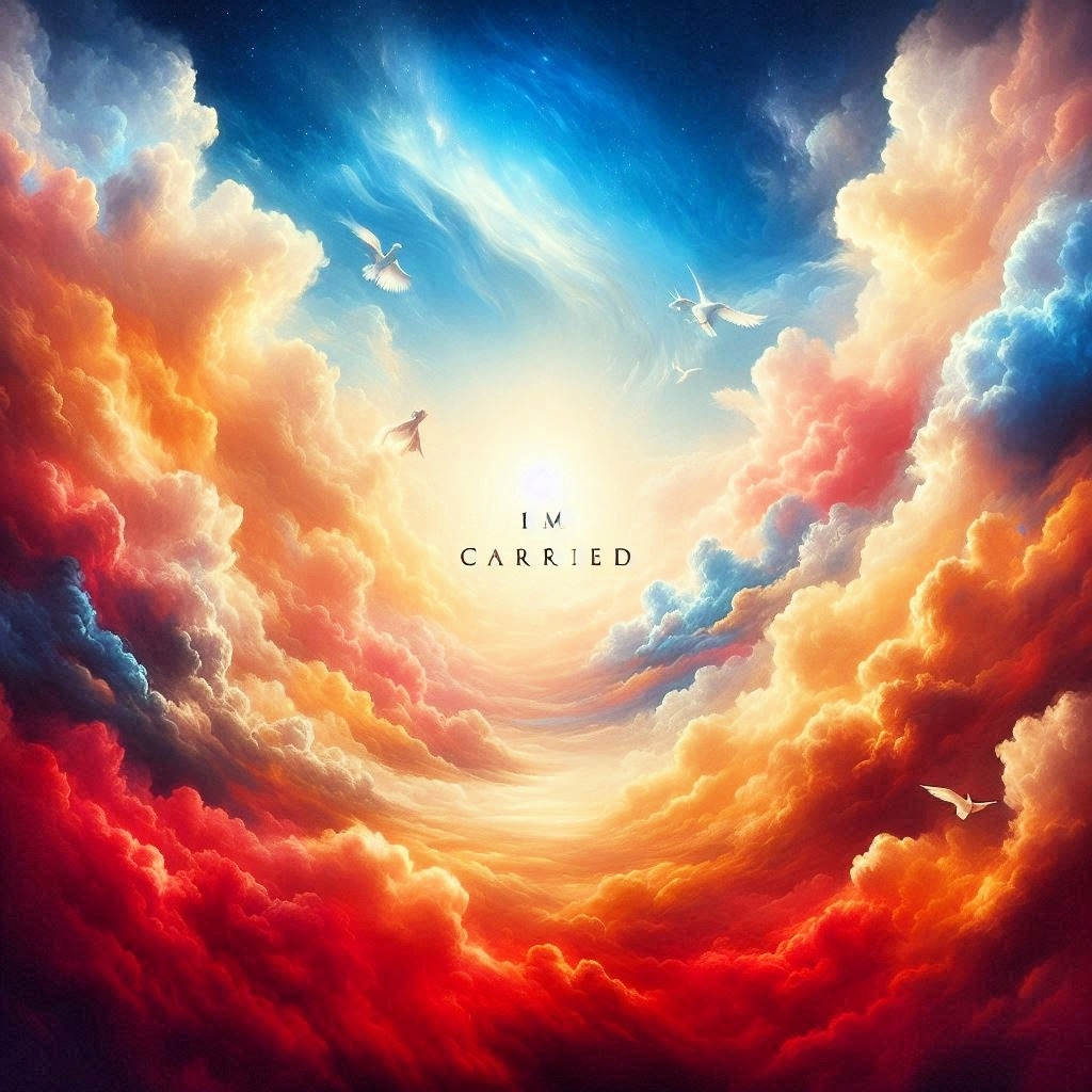 “I’m Carried” is a radiant visual representation of divine peace, surrender, and spiritual protection. Wrapped in swirling clouds of fiery red, golden amber, and heavenly blue, doves soar toward a glowing light — a symbol of being held, carried, and uplifted even in life’s most chaotic storms.