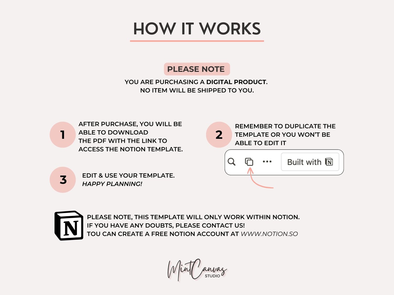 • NOTION - You will need a FREE Notion account to use this template. A basic understanding of Notion is necessary to utilise the template effectively. Create an account here: https://www.notion.so/