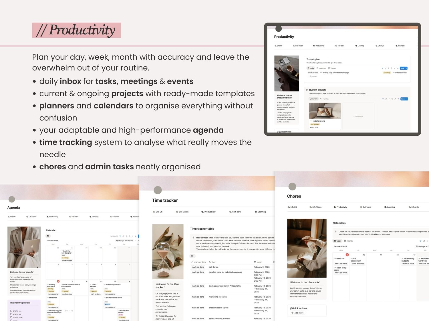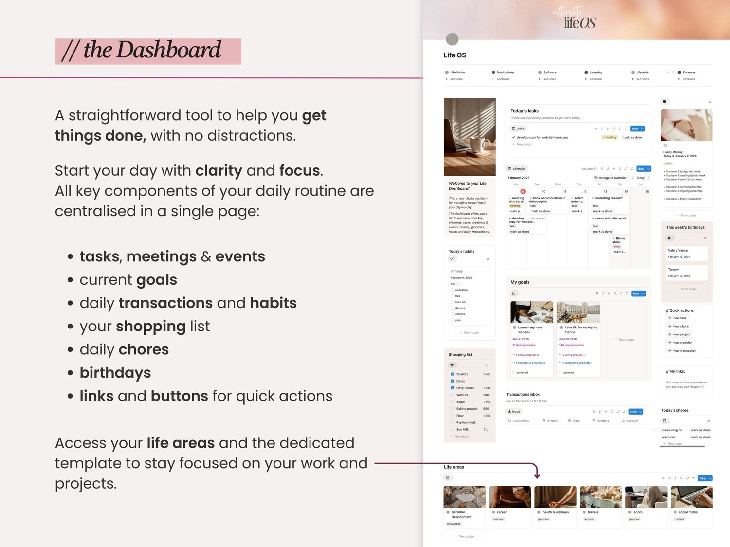 This Notion template is powered by the best productivity methods that keep you on track. With its intuitive layout, you’ll master your routines, track habits, plan meals, manage your budget, and chase big dreams—all with ease and confidence.