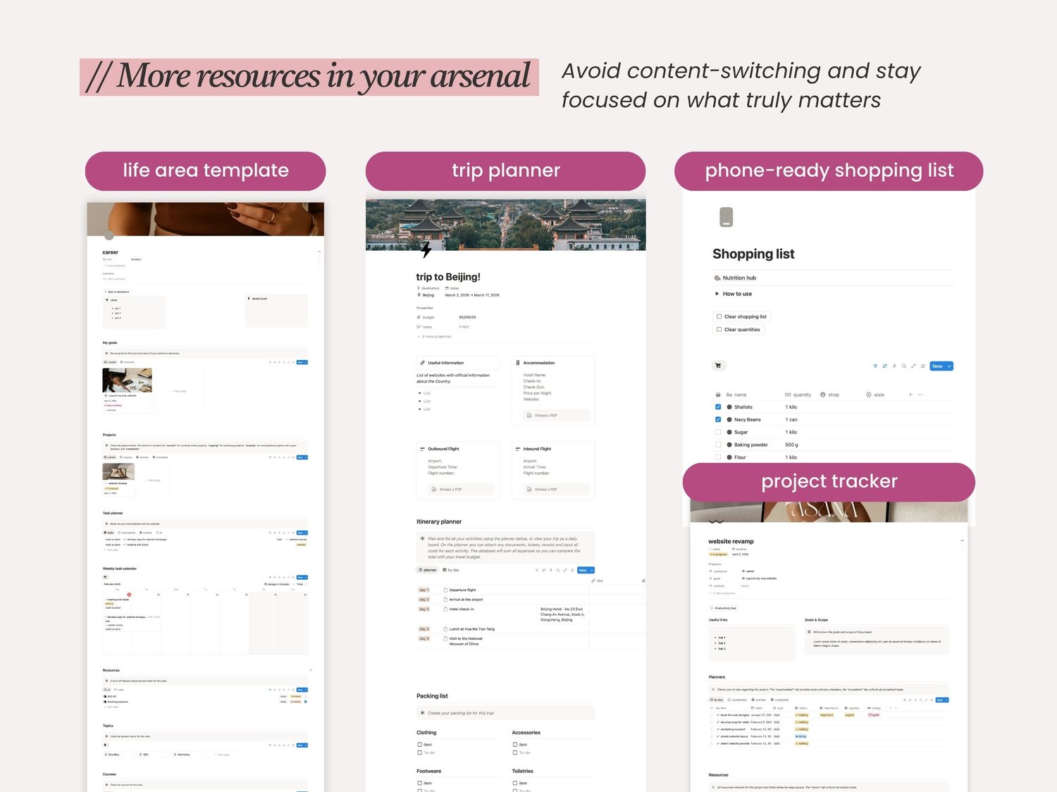 TEMPLATES for life areas, projects and trips make your life easier, saving you precious time while planning