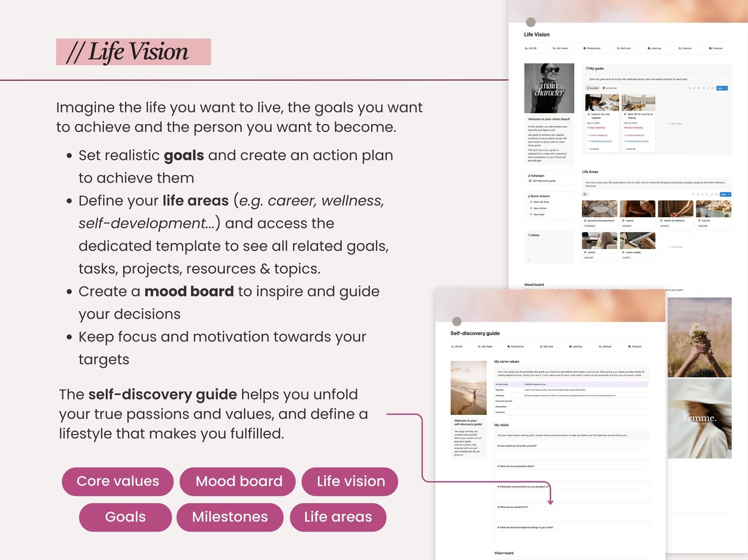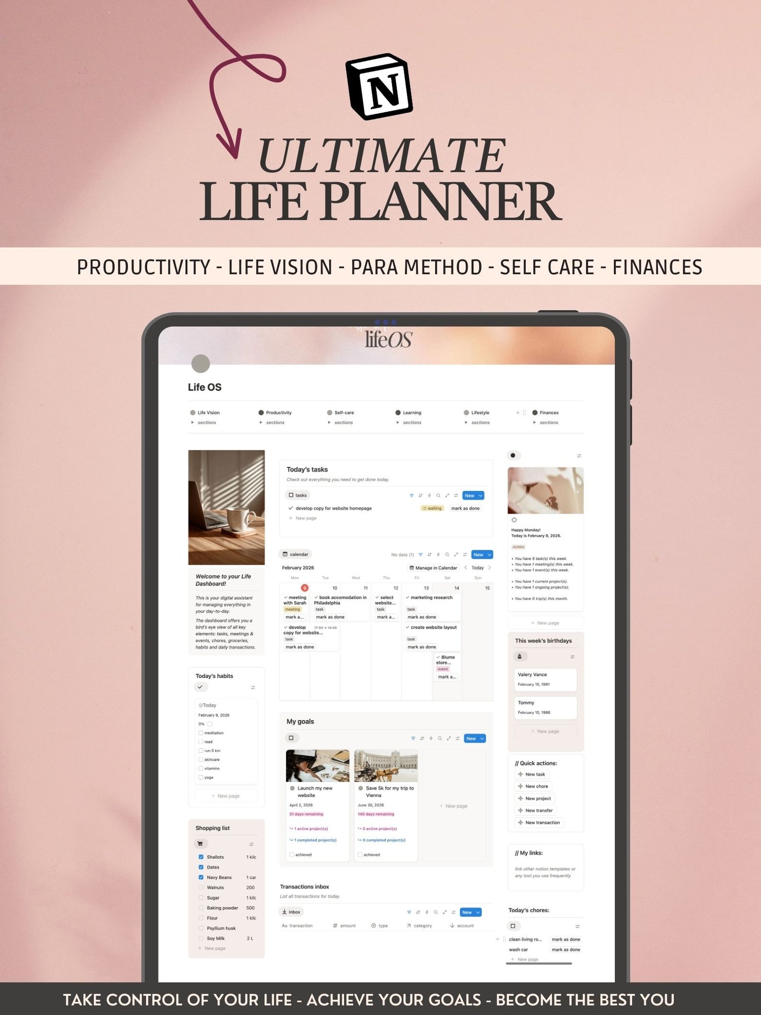 Step into clarity with this Notion Life Planner, your all-in-one command centre for productivity, goal-setting, and real consistency. From building routines and tracking habits to organising finances, planning workouts, and designing your dream life, everything you need is beautifully gathered in one inspiring tool.