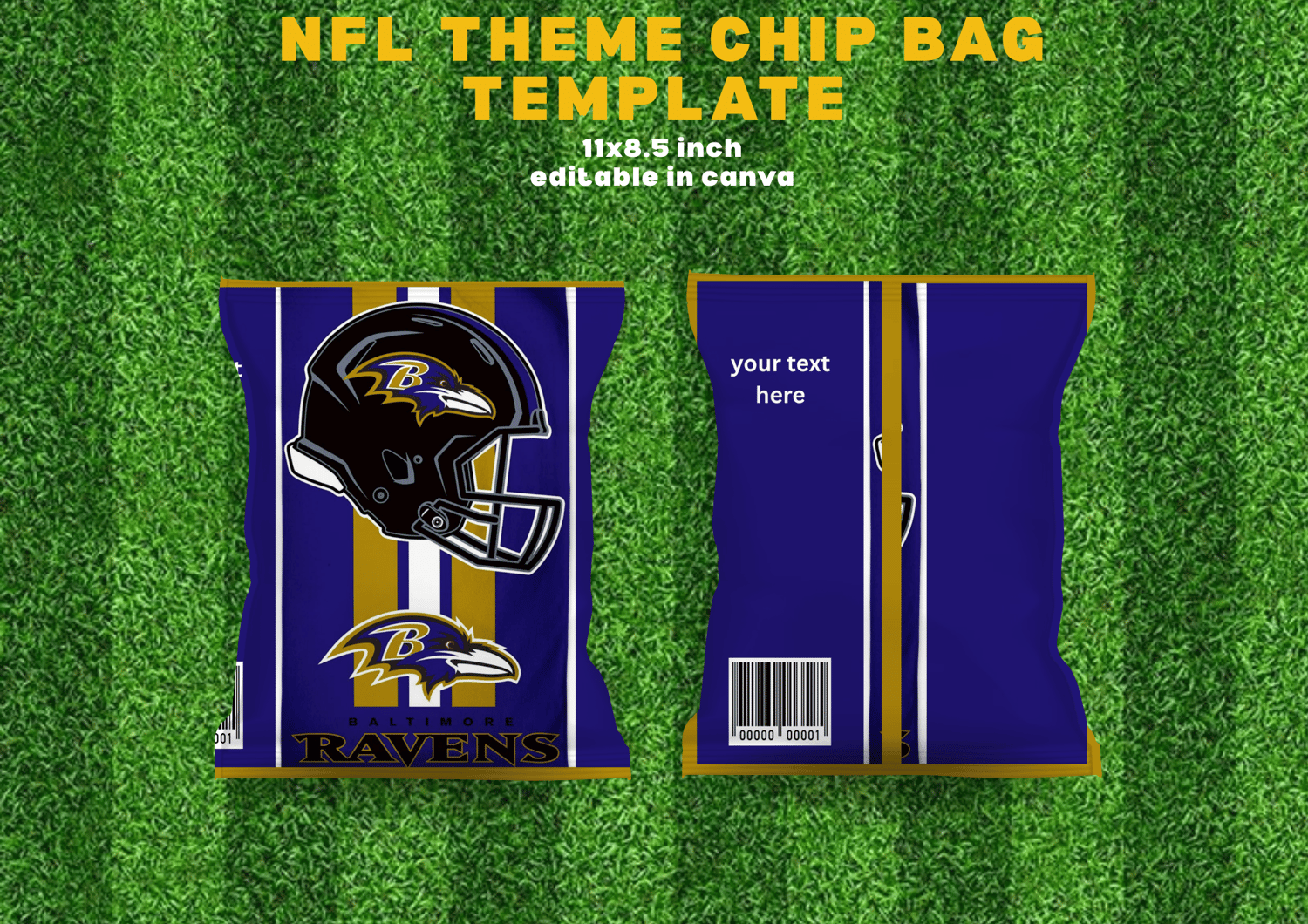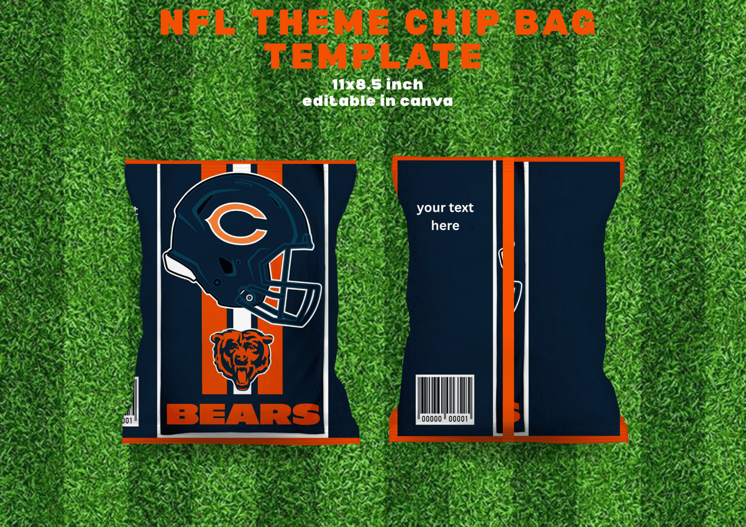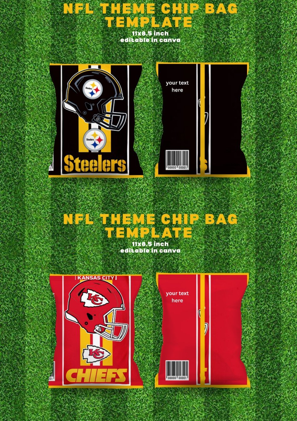 Bring the excitement of game day to your next party with these NFL-inspired chip bag templates! Perfect for football-themed birthdays, Super Bowl parties, tailgates, or any fan celebration. Each bag design reflects the energy and spirit of the NFLโadd your favorite team colors or logo for a custom touch!