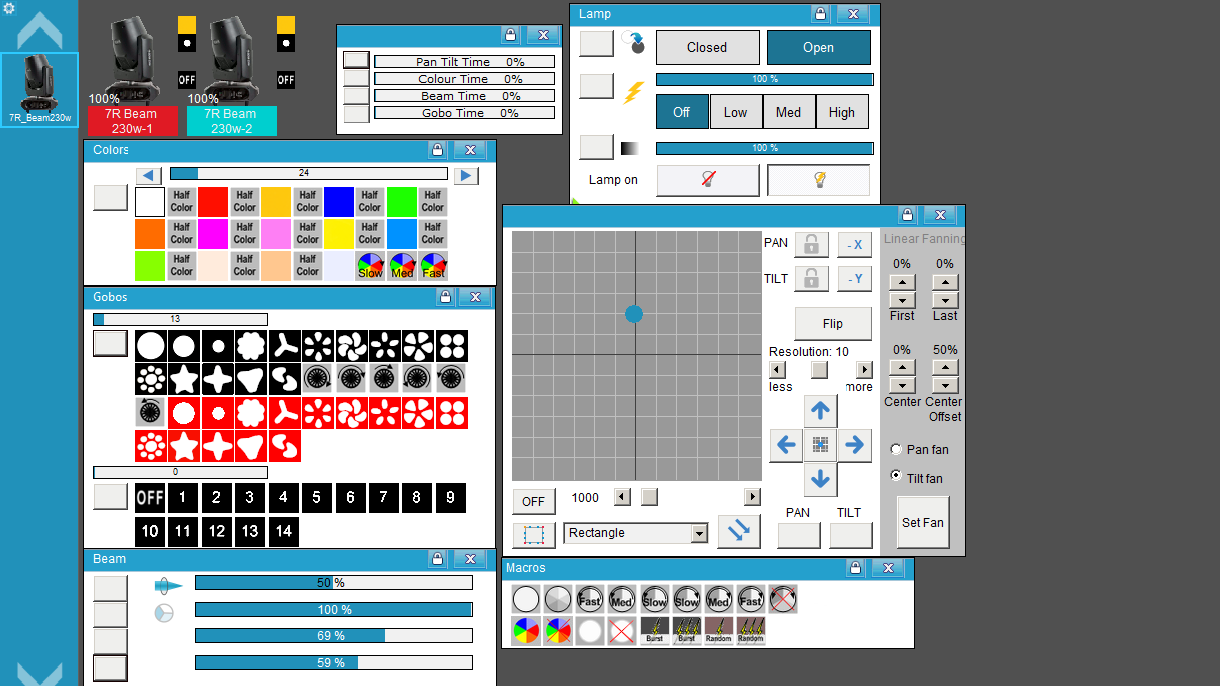 • Velocidades de Color, Beam y Gobos.