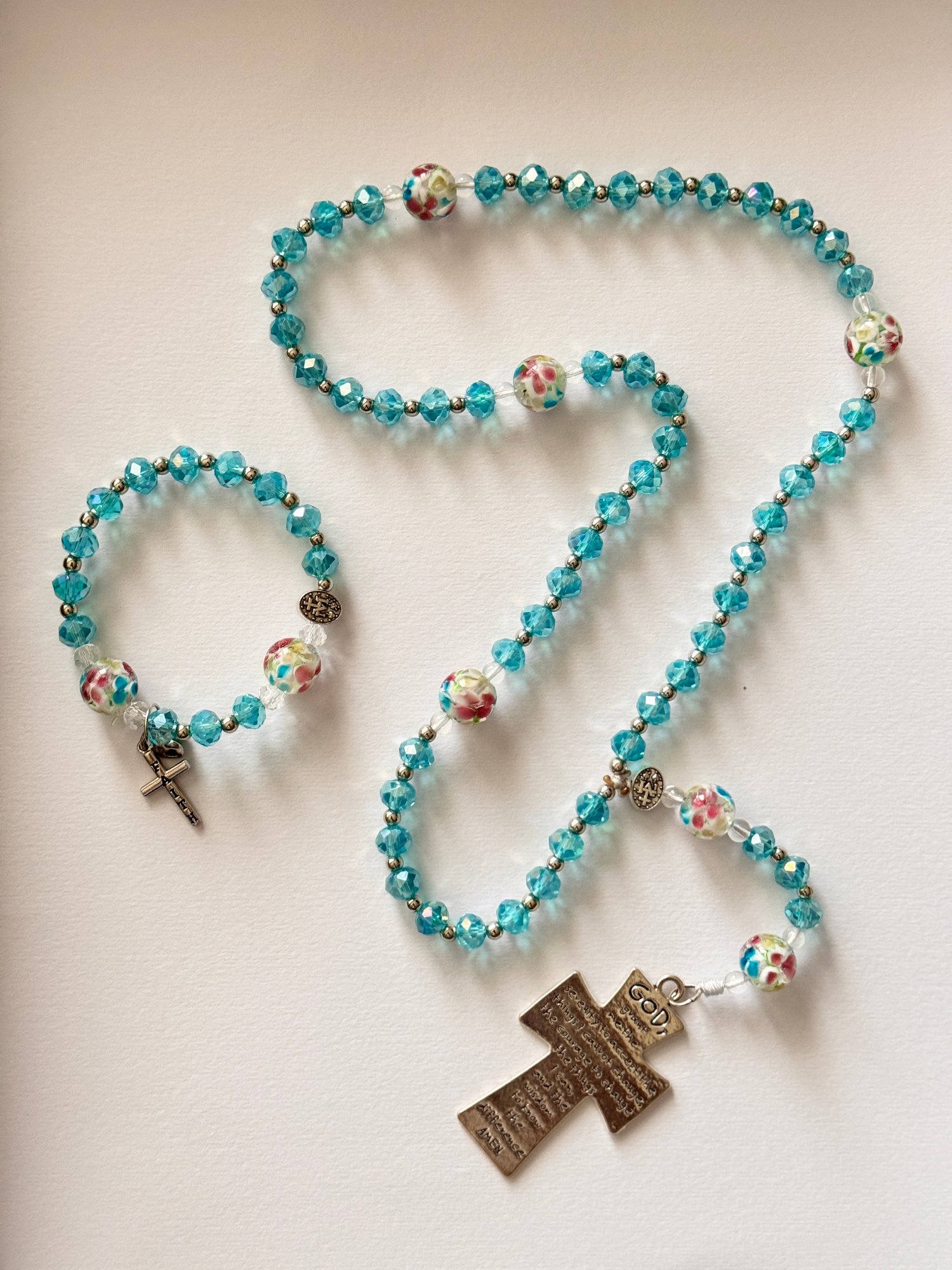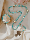Discover the perfect way to deepen your prayer practice or share faith with loved ones. This stunning three-piece rosary bundle features radiant turquoise crystal beads, delicate floral accents, and elegant silver-tone details—creating a cohesive collection that's both beautiful and spiritually meaningful.