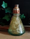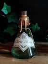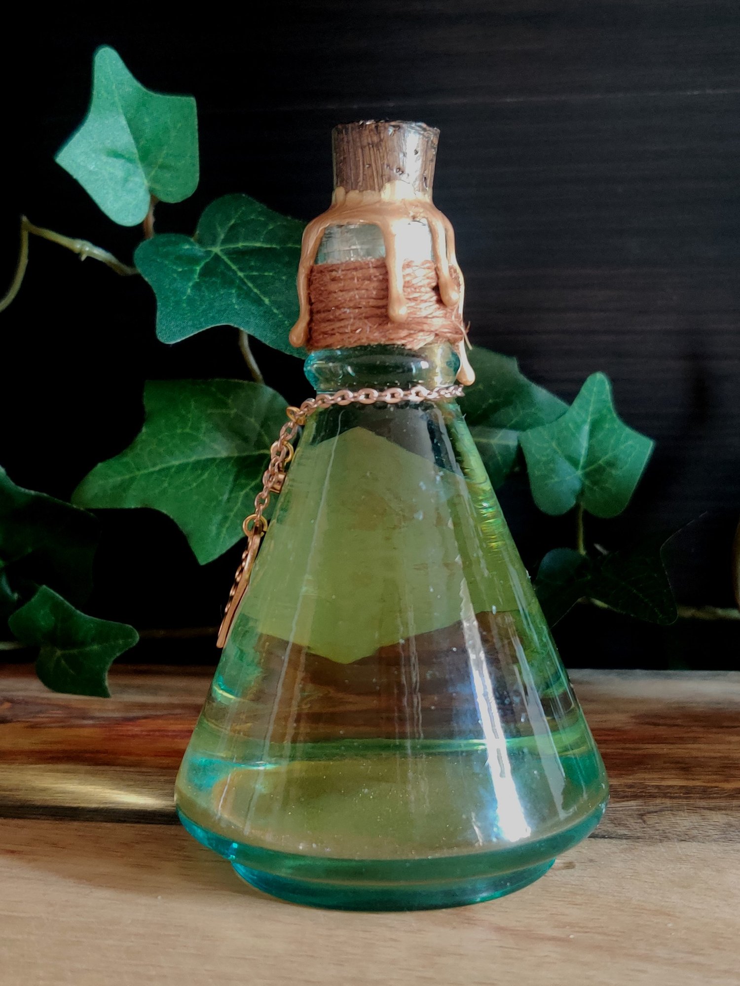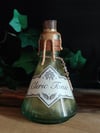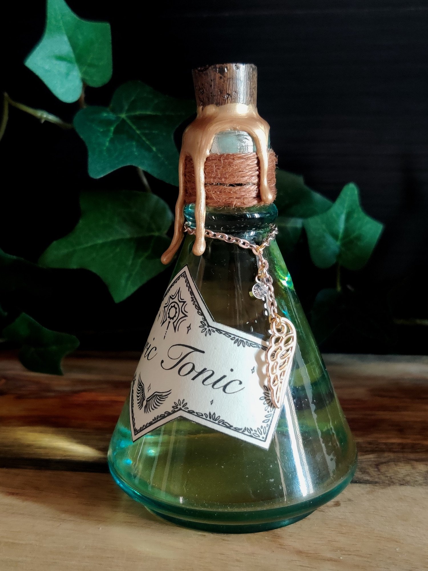 Pullossa on hennon kellertävää nestettä ja se on koristeltu käsintehdyllä etiketillä, juuttinarulla sekä riipuksilla.