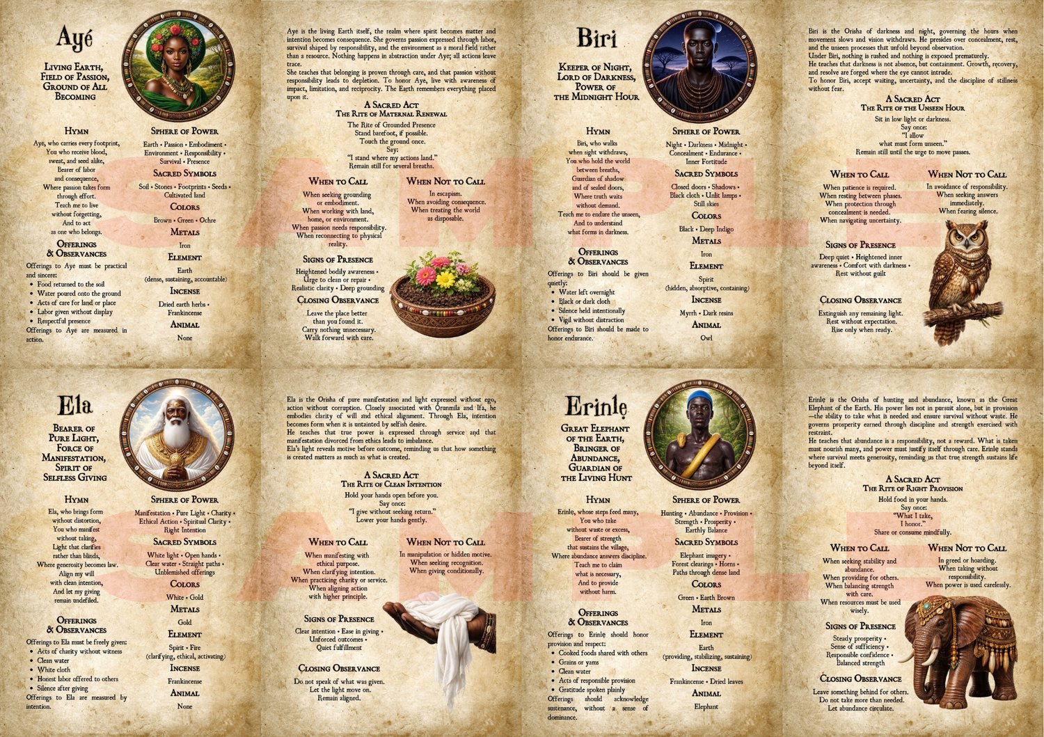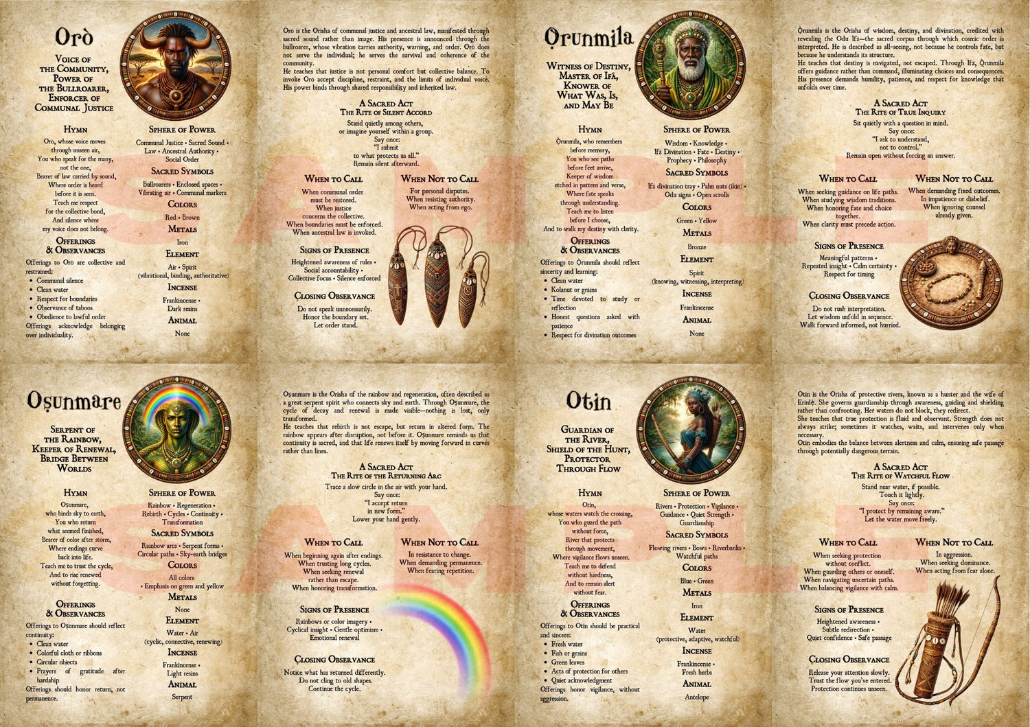 Each Orisha is presented with reverence and clarity, including hymns, sacred acts, offerings, signs of presence, and guidance on when to call or refrain.