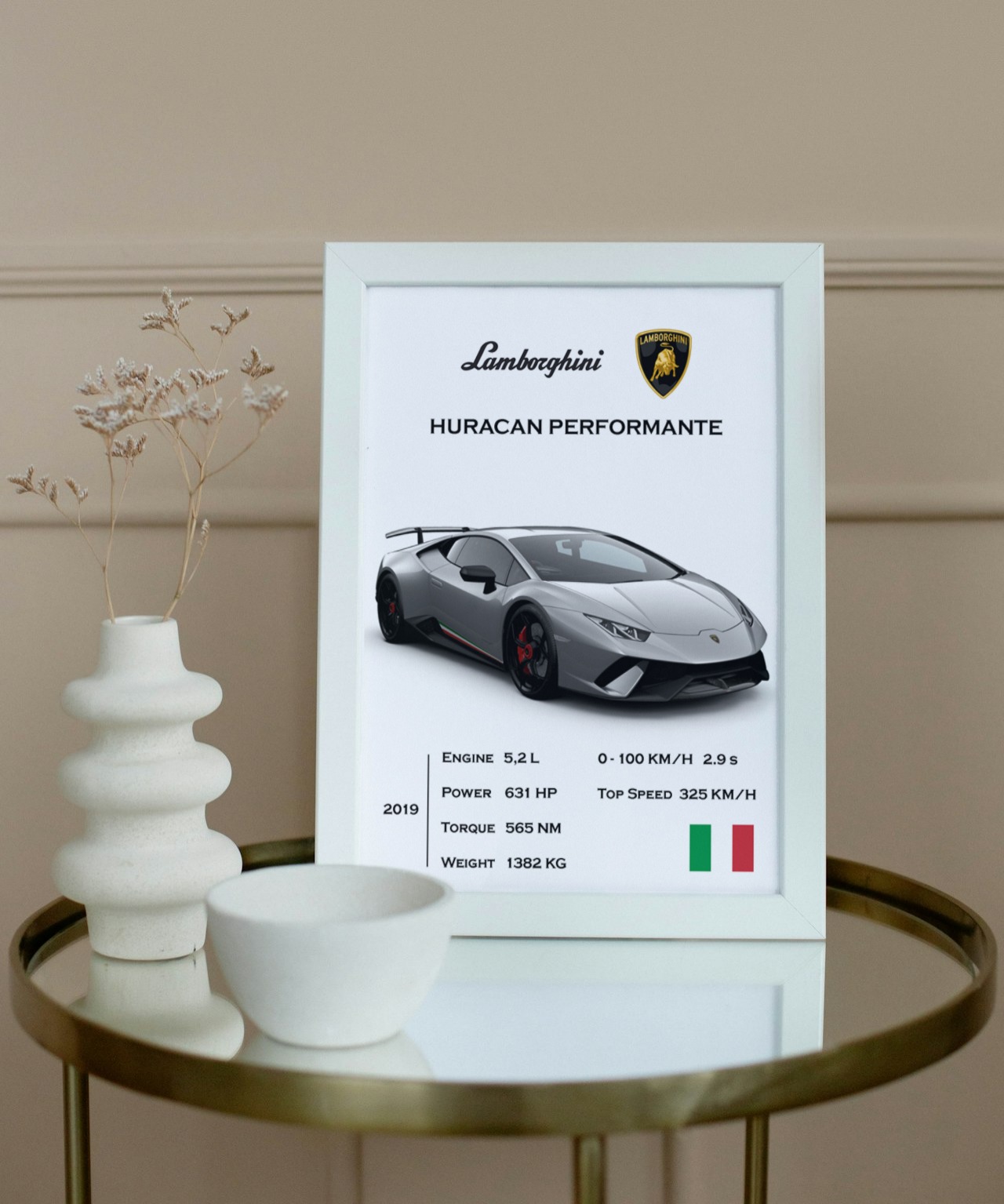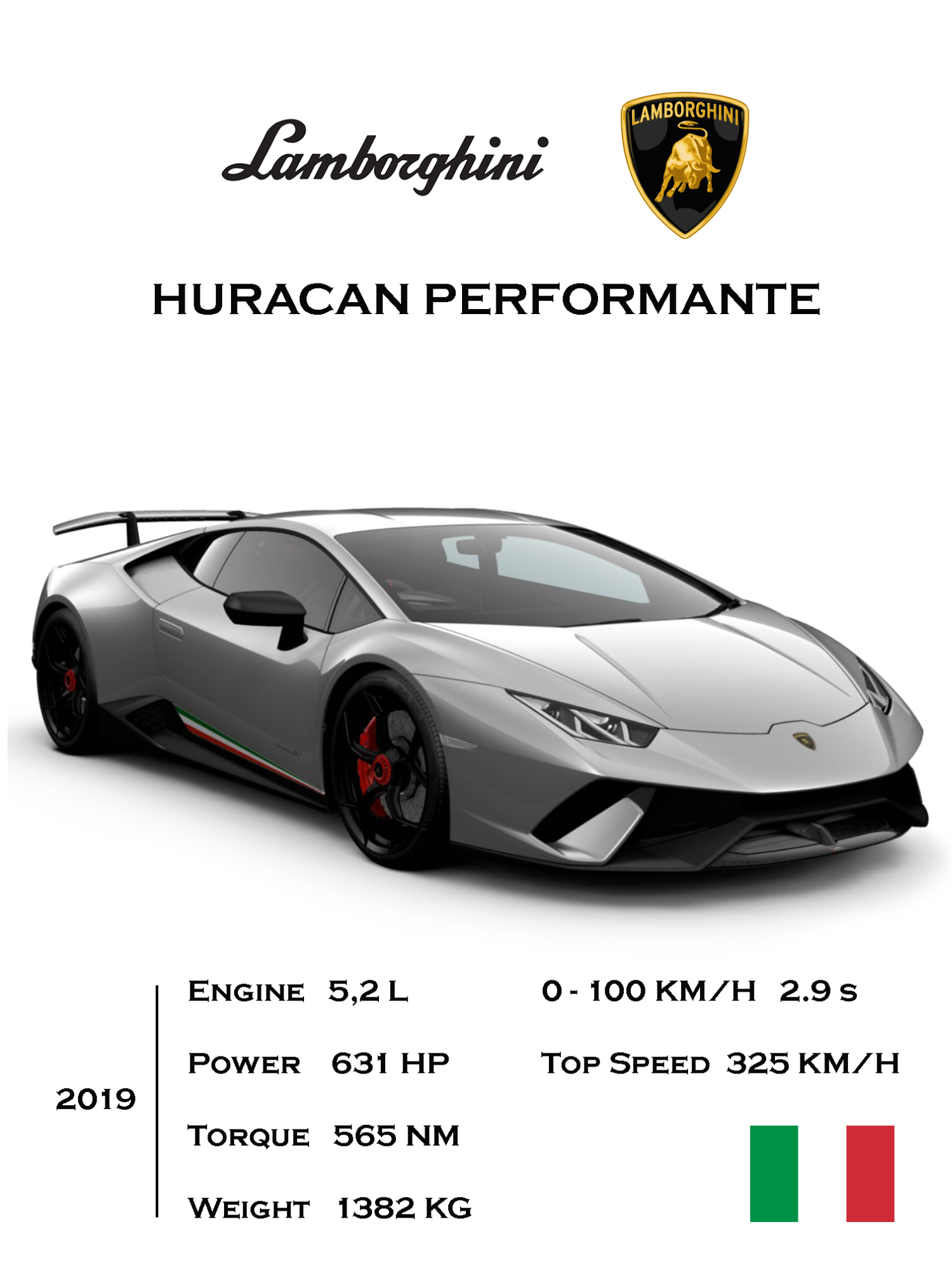 This poster captures the essence of Italian craftsmanship and high-performance engineering, showcasing the dynamic design and exhilarating performance of the Huracan Performante.