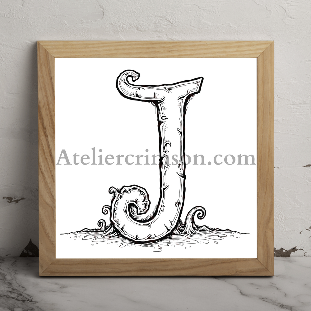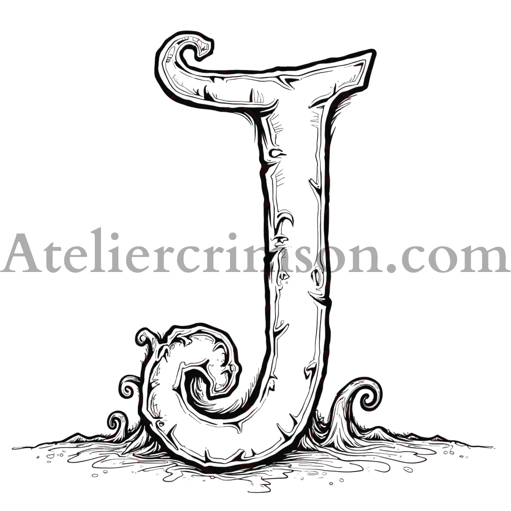 The letter J colloring book jack halloween Tim Burton-inspired alphabet art. Spooky-cute character in coloring book style. Perfect for Halloween crafts or gothic decor.