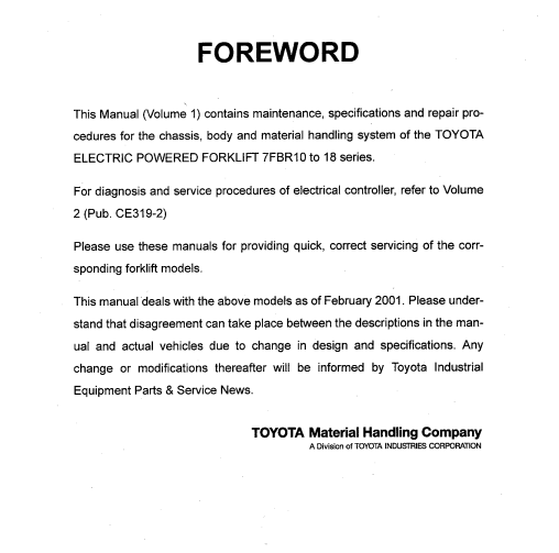 Toyota 7FBR10 7FBR13 7FBR15 7FBR18 Forklift Repair Manual Volume 1 Pub No. CE318-2