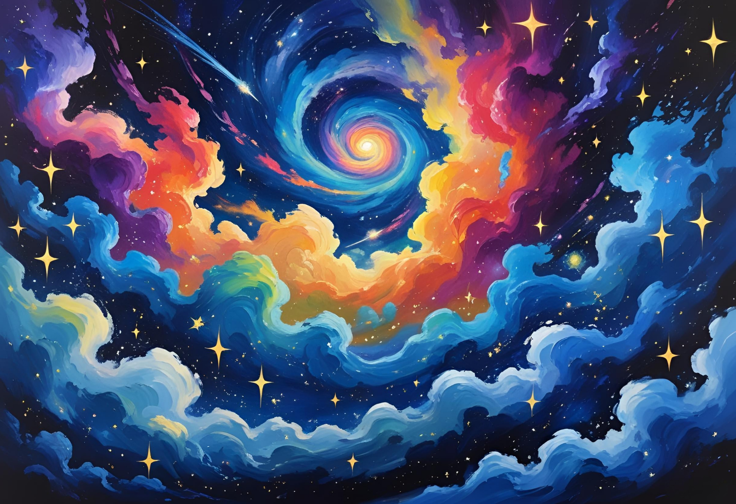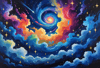At the center of the piece is a spiral of colors, implying to be a galaxy. Due to the galaxy’s swirl, it gives off a sense of movement. Surrounding the galaxy are clouds, with the nearest one to the vortex donning a combination of blue, pink, purple, and yellow while the rest of the clouds are blue with a hint of yellow in it. The piece also includes numerous stars twinkling around. “Cosmic Serenade” portrays an image of space, featuring a galaxy and a variety of cosmic clouds. It is mesmerizing to look at and the variety of colors prevents the appearance to look dull. Overall, it is a great piece demonstrating the beauty and peculiarity of space.