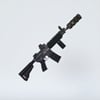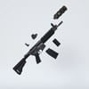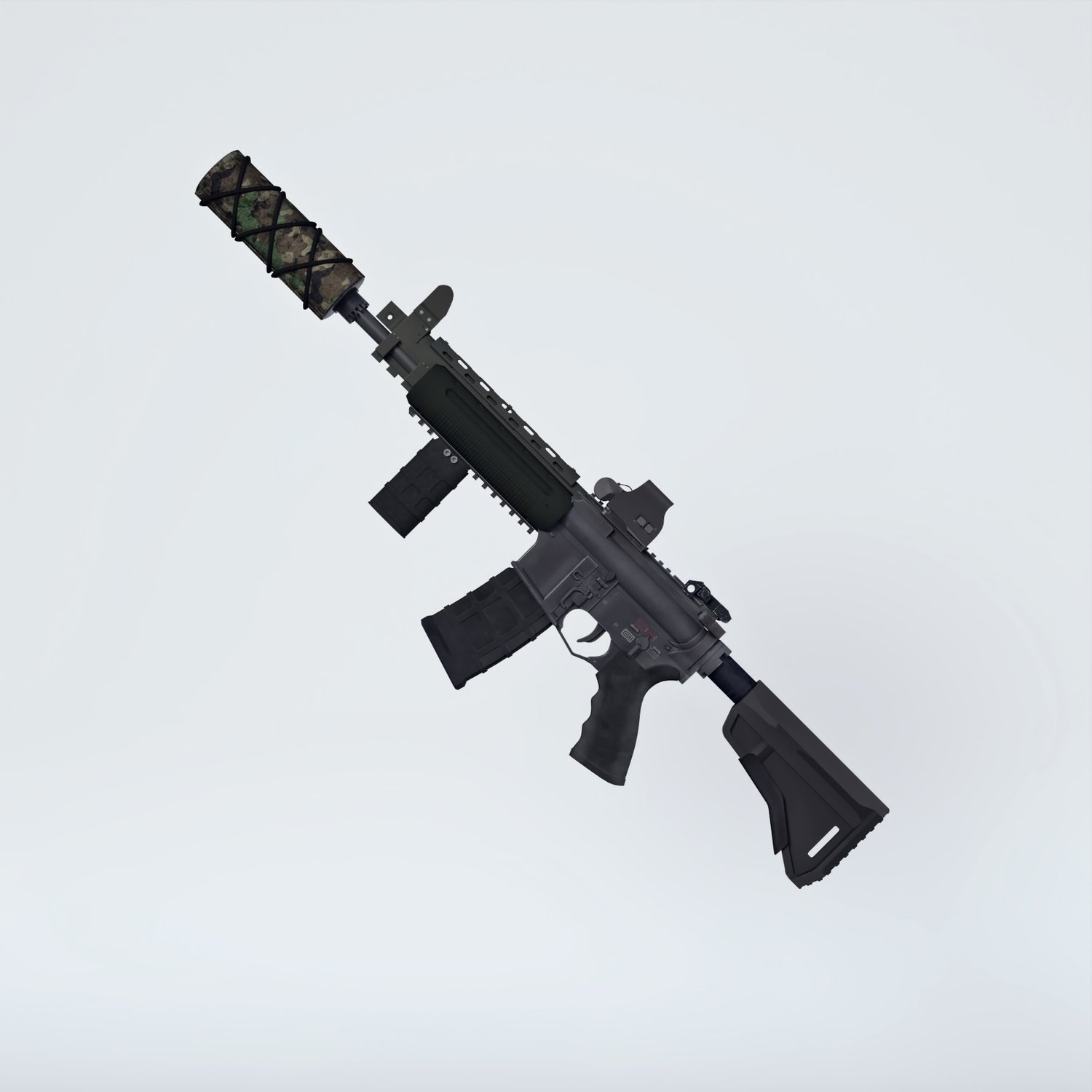 A CQB variant of M4 rifle (close quarters combat), for special forces. Includes a silencer, red dot sight and a front grip handle. Trigger, stock, safety, bolt, bolt cover etc also rigged for more realistic pictures. The prop is converted and rigged for use in DAZ.