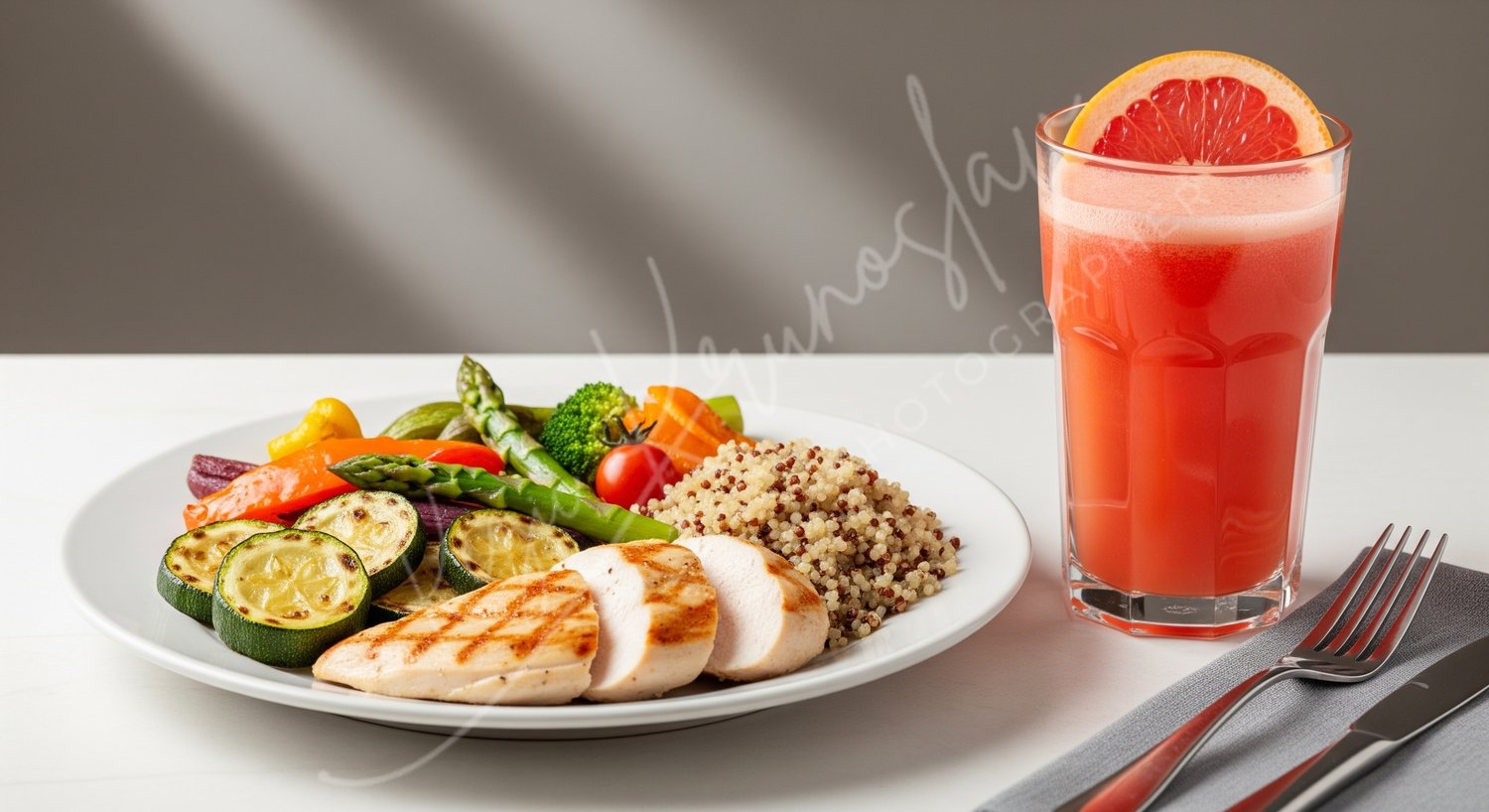 Elevate your brand with professional, clean-cut aesthetics. This high-resolution photograph features perfectly grilled chicken breast, fluffy nutrient-rich quinoa, and a vibrant medley of steamed vegetables, including asparagus and broccoli. Accompanied by a fresh grapefruit juice, this image embodies the "clean eating" and "fit lifestyle" movement.