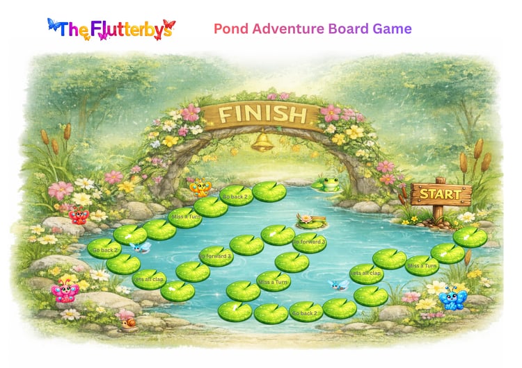 This printable board game encourages turn-taking, counting, and following simple instructions — all wrapped in a colourful forest adventure with the Flutterbys and their friends.