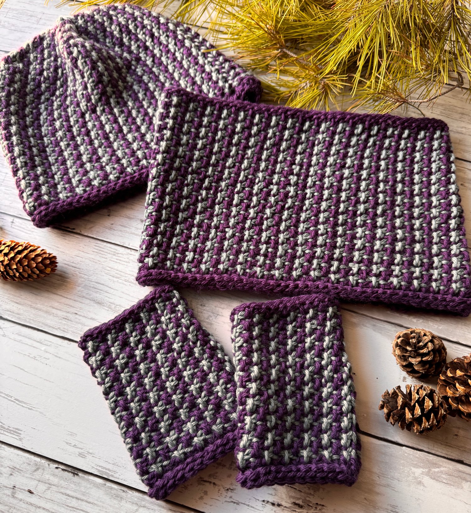 The design features Twice Sheared Sheep Everyday Merino (affiliate link) Worsted weight yarn in Plum (MC) and Dove (CC). 90 yards/color. You can purchase the kit (pattern included) here.