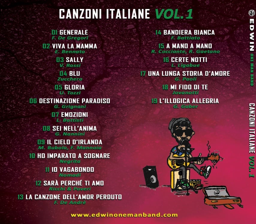 19 glorios Italian songs interpreted and arranged in folk style with my one man band acoustic set (voice, guitar, harmonica, kazoo, cajon, tambourine).