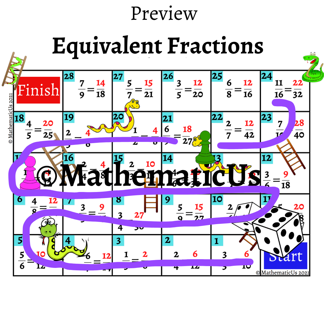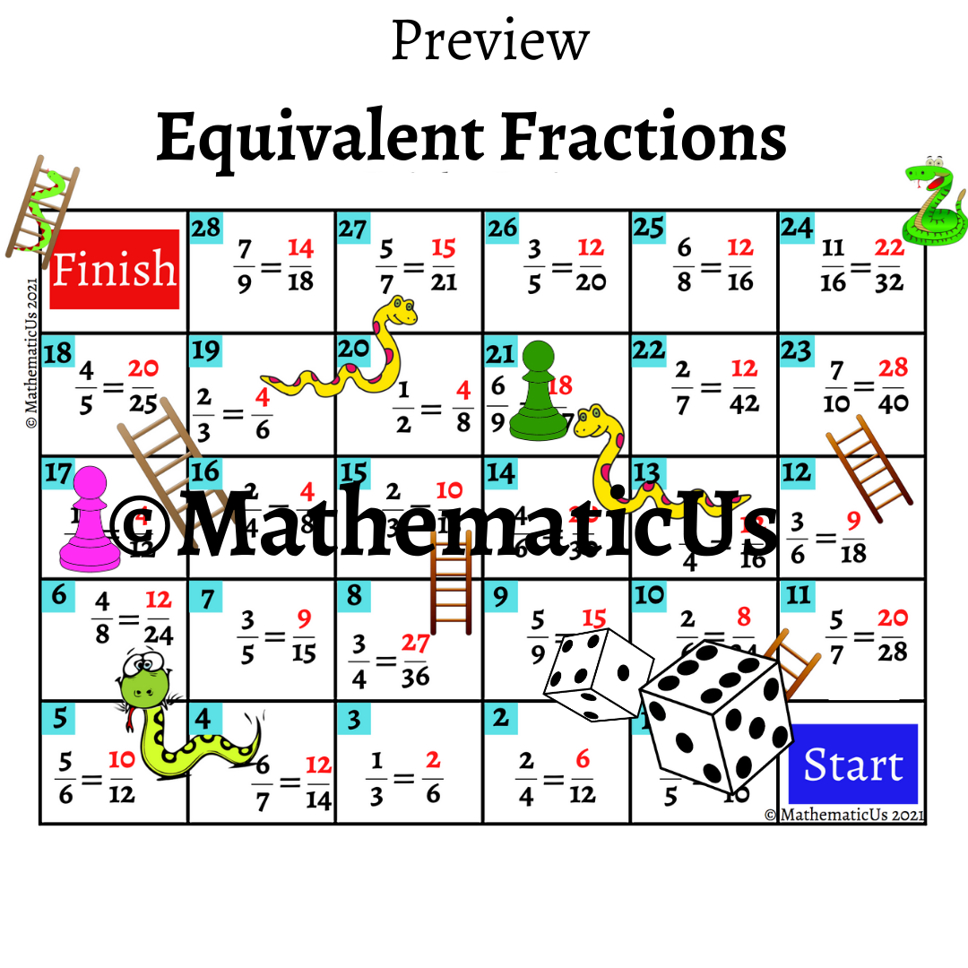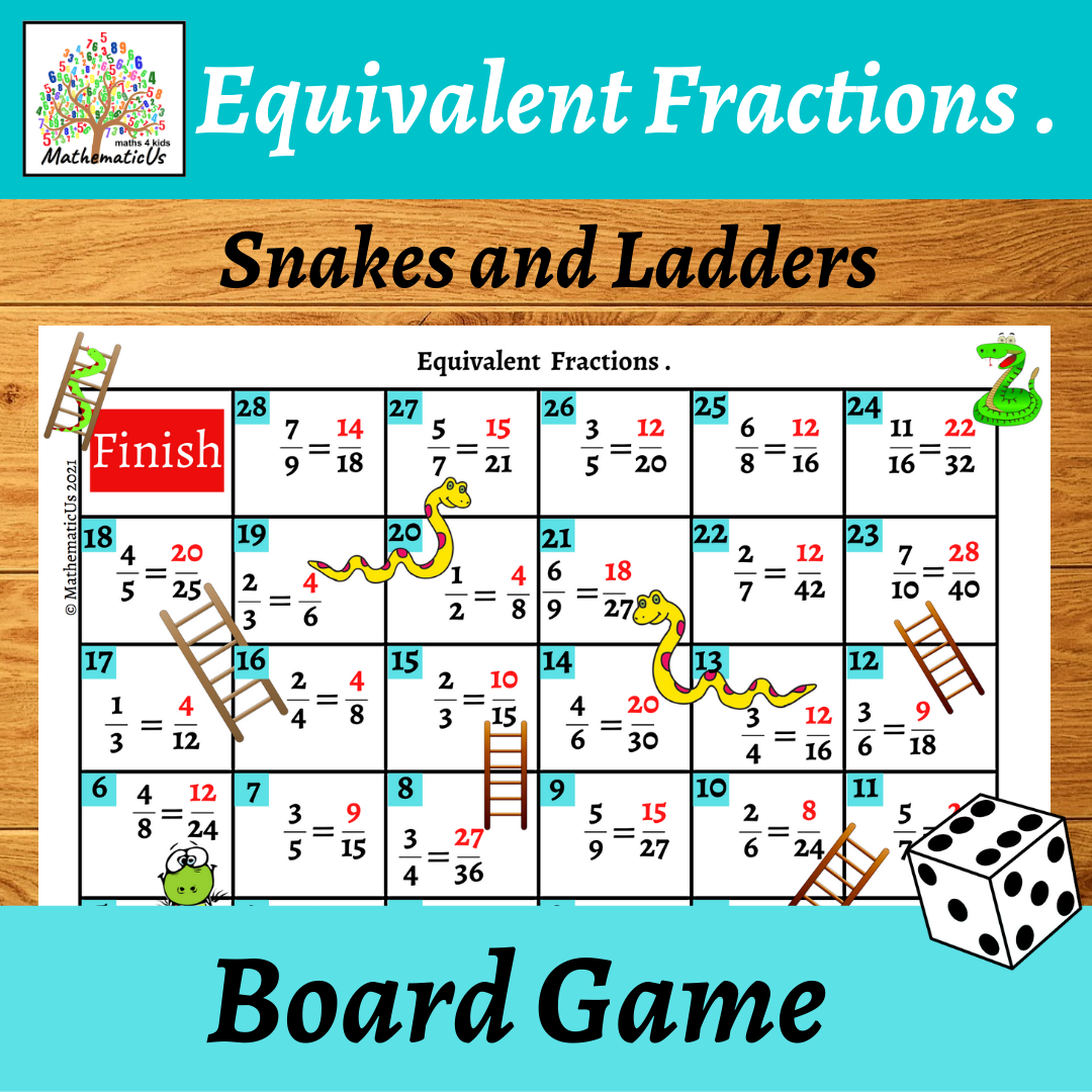 It is a Snakes and Ladders board game. Children have to make equivalent fractions . This math game is a great review and an engaging way to practice more in Equivalent Fractions. Children will have fun playing this dice game.