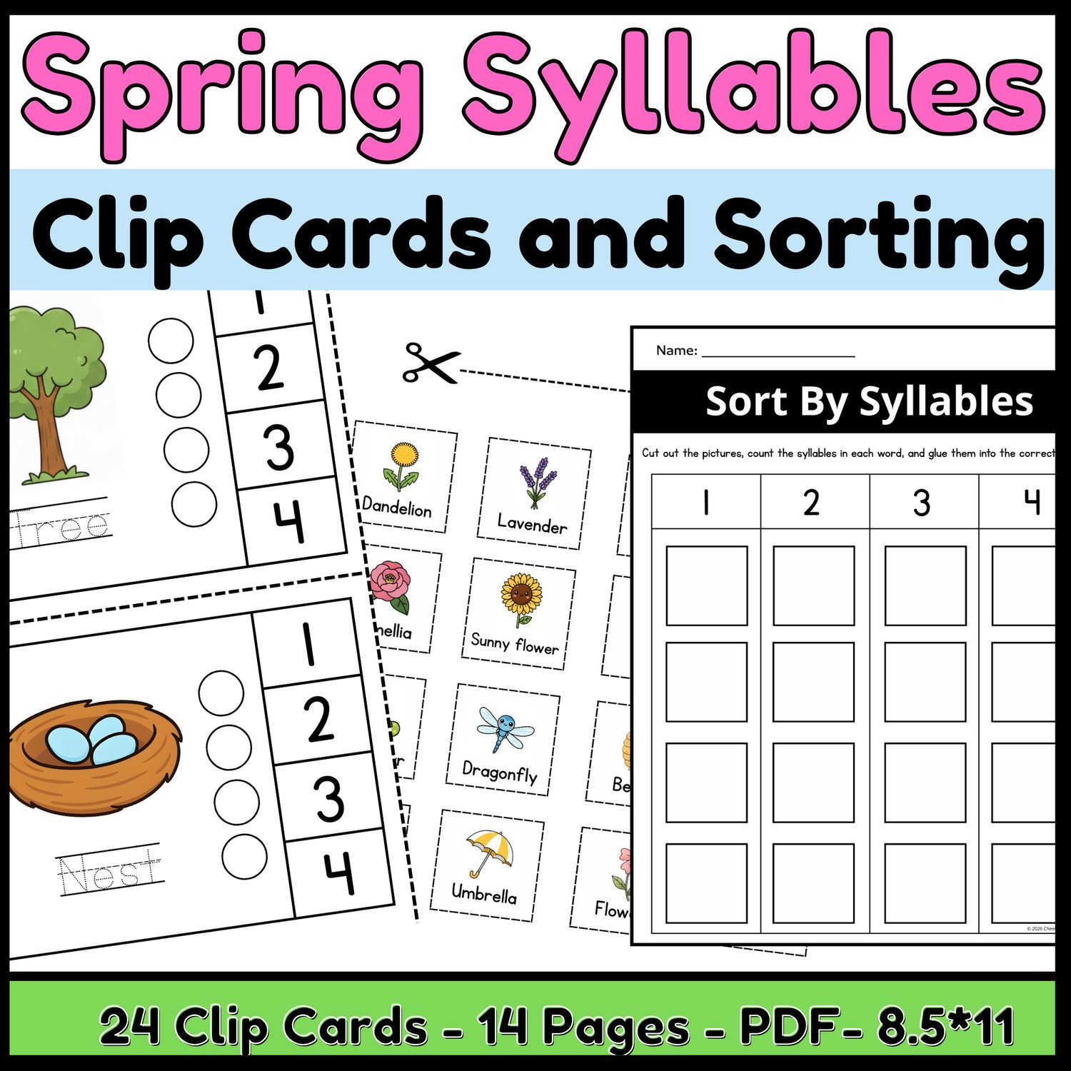 Spring Syllables Clip Cards | Sort by Syllables Activity