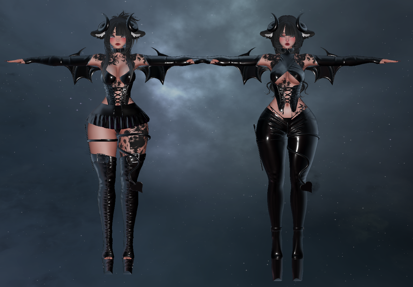 Bodysuit Net / Crop / Bra Top / Bandage Top / Bat Top / Leather Top / Panty / Pasties / Short / Skirt 1 / Skirt 2 / Pants / Thigh / Heels / Belt Boots / Leather Heels / Heels