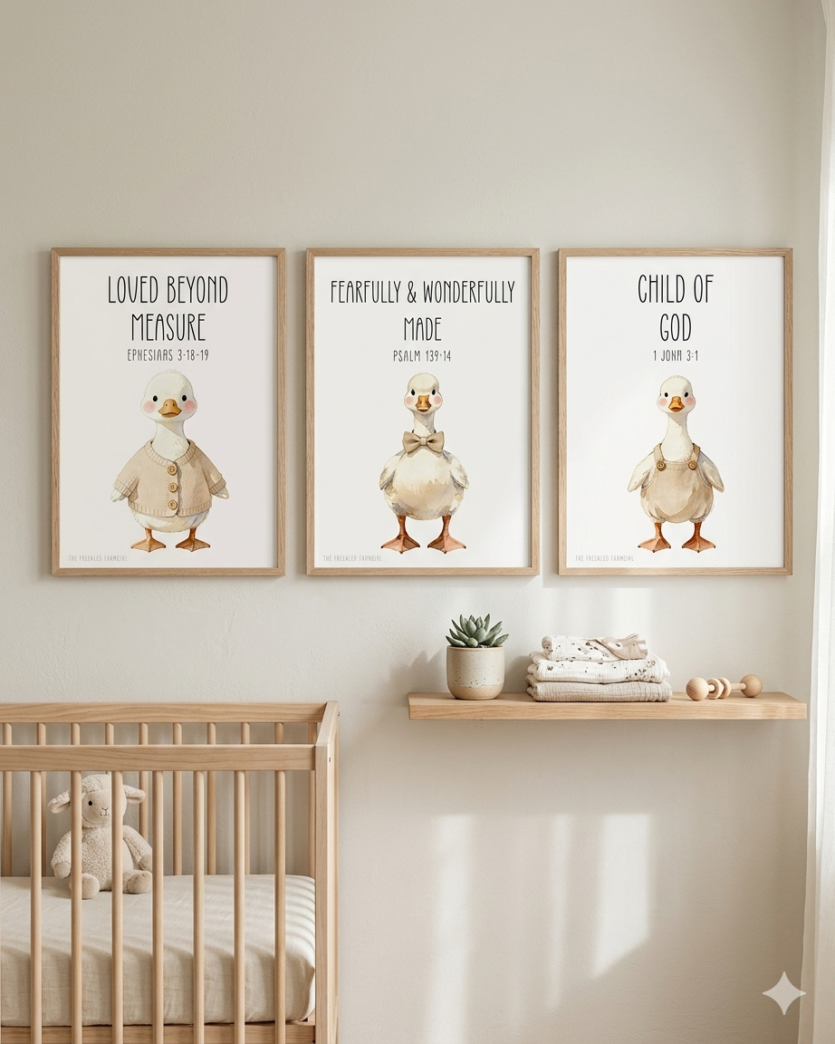 This set of 3 whimsical duck prints features soft, cozy tones and meaningful Bible verses—perfect for a faith-filled nursery that feels calm, warm, and full of love.