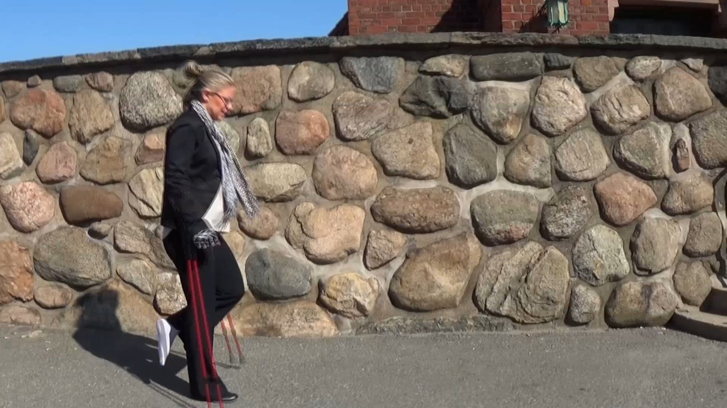 In this clip can we see Sarah crutch along a wall and upp some steps.She hold her sprained ankle behind her when she crutch and today she has a white sock over her hurt foot.She crutch to the car and put her crutches in the storage space in the back of the car and jump on one leg to the rear passenger seat there she sits down