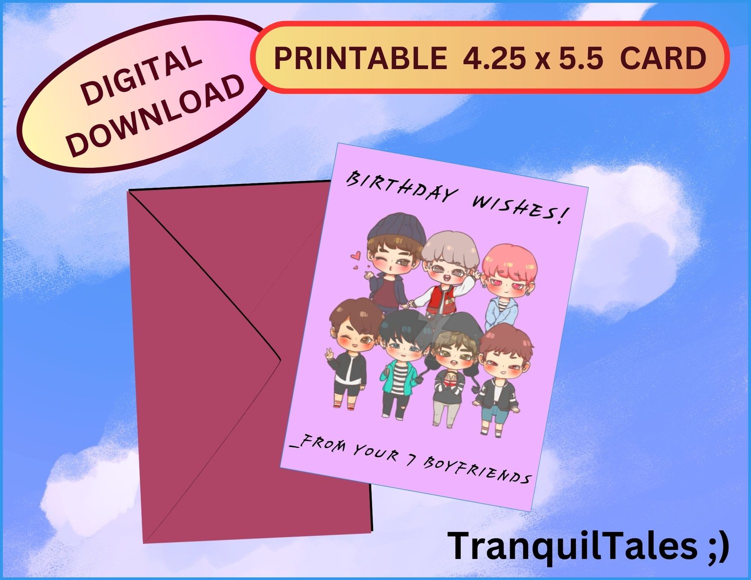 BTS - BIRTHDAY CARD - 4.25" x 5.5" PRINTABLE DIGITAL GREETING - Jungkook - V - Jimin - SUGA - Jin - RM - j-hope