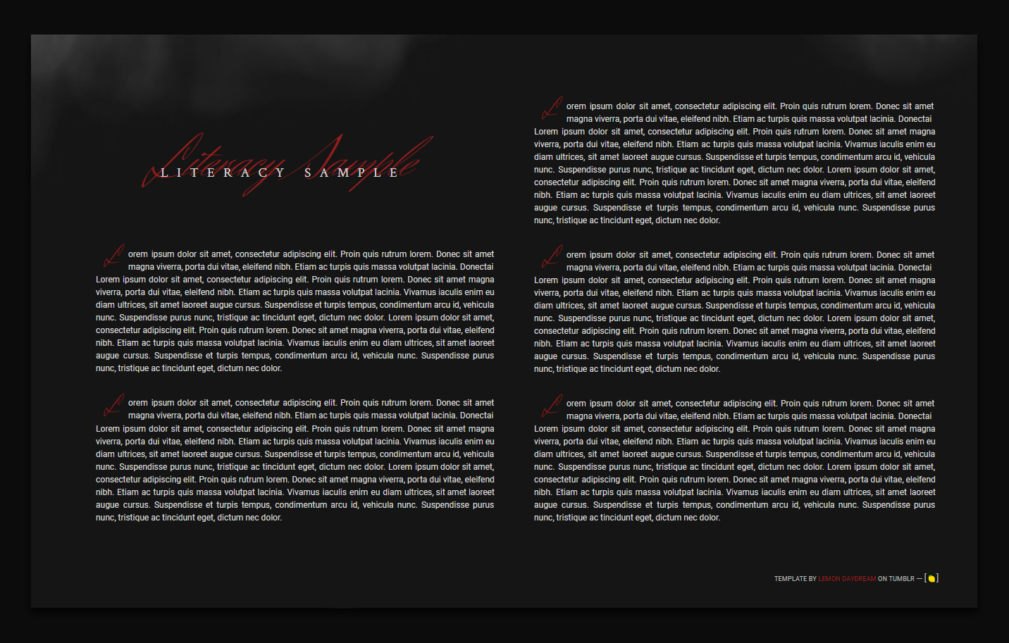 Okay, so the name is a little on the nose, the BLOOD ORANGE template with, you guessed it, blood. Great for that gritty crime drama, great for a vampire, spooky season, noir, you get the idea. Customizable, change images, change the colors. Feel free to edit it in any way, shape, or form just please donβt remove my credit and link toΒ lemondaydream.Β