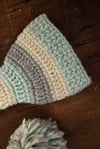Adorable handmade sleepy hat in soothing shades of mint, ivory, and gray. Features chunky crochet texture and a soft oversized pom pom at the end β perfect for cozy newborn photos.
