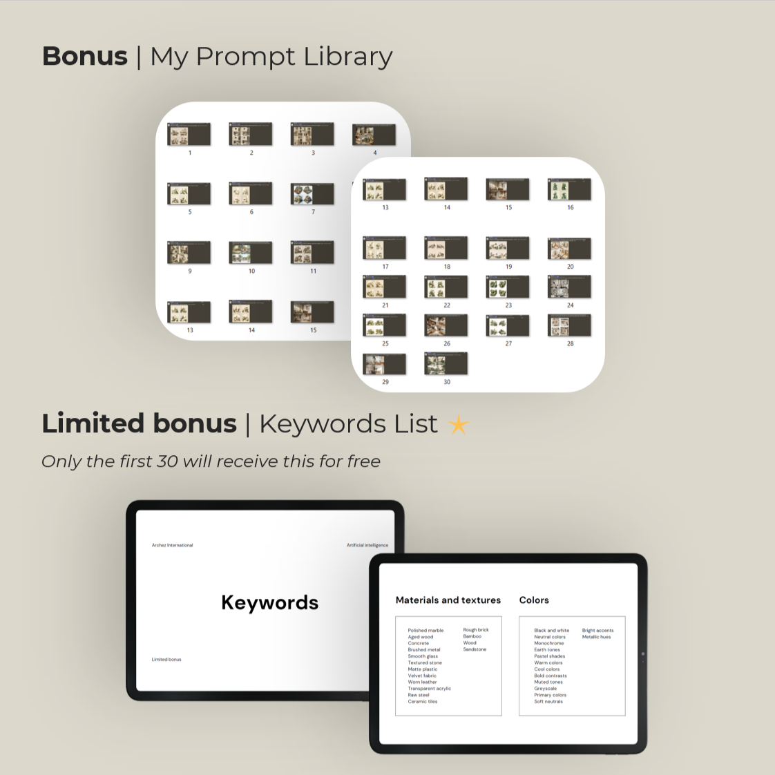 · Limited bonus: Keywords List, for creating descriptive and effective prompts — Only the first 30 will receive this for free