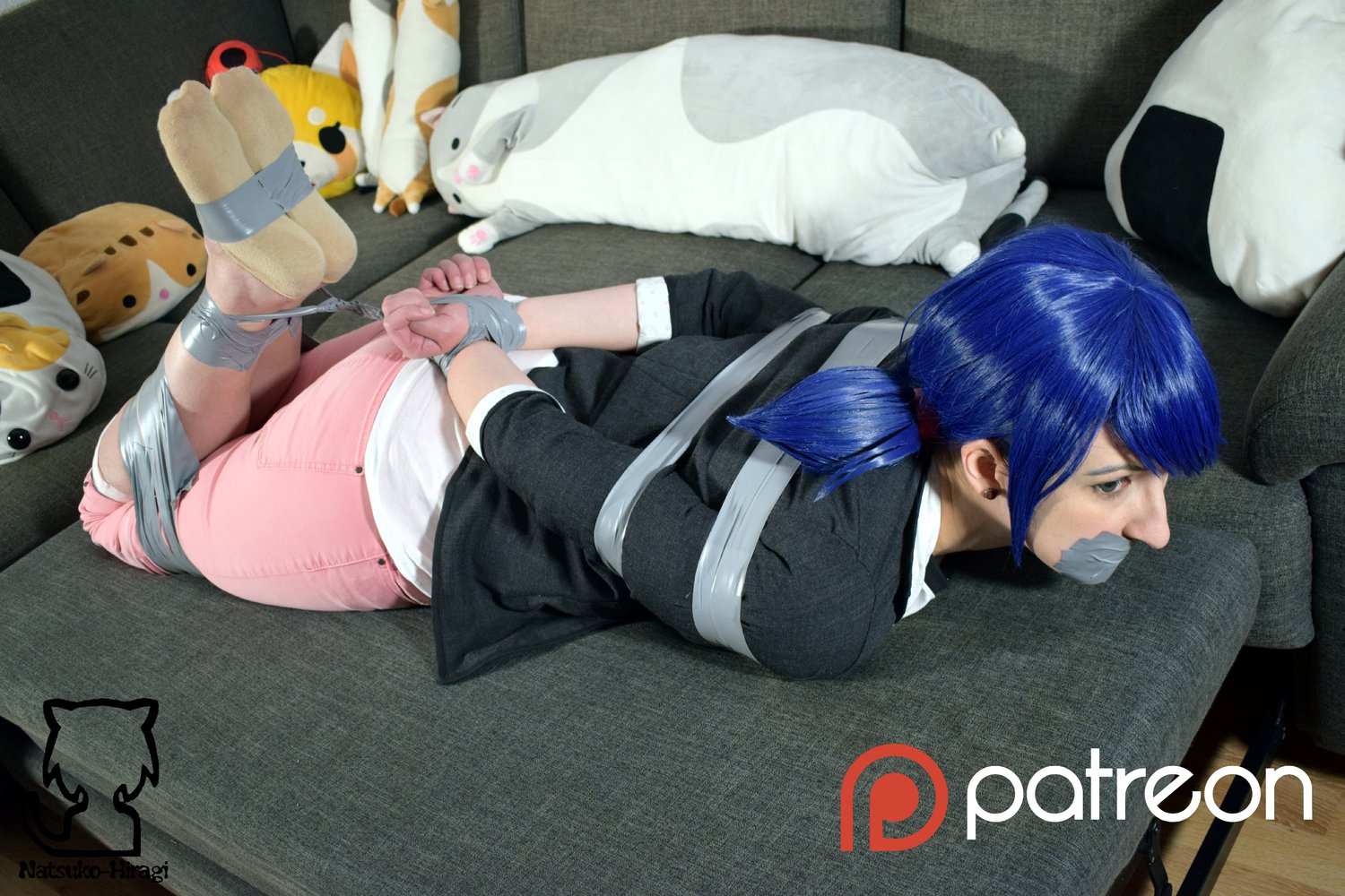 Picset includes: Tapegag, mouth sealed, tape hogtie, socked feet, on screen gagging, layered tapegag, heavy tape bound
