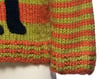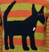 Materials: Worsted weight wool blend: 170 (195, 220, 250, 315, 375, 435, 490, 555) yards each A and B; fingering weight wool: 90 yards C, for dog; small amount of white superwash wool in sport weight or finer, for chest (D). Model knit in Vintage by Berroco (50% acrylic / 40% wool / 10% nylon; 100 gram hank = 217 yards): color #5164 Tang (A) and #5165 Wasabi (B); dog knit in Baby Ull by Dale of Norway (100% superwash merino wool; 50 gram skein = 180 yards): color# 0090 Black (C).