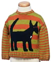 This pullover is worked from the bottom up in pieces, then sewn together. You may either work a regular shoulder or a buttoned shoulder, which will make it easier to pull the sweater over the child's head. The dog is worked separately from either written instructions or a chart, then sewn on.